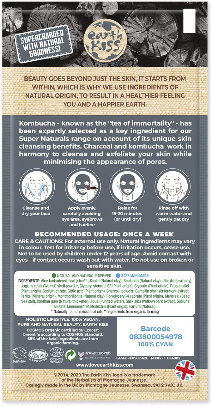 Earth Kiss Supernaturals Kombucha and Charcoal Mask (10g) - Charcoal and Kombucha work in harmony to gently cleanse and exfoliate your skin, slough away dead skin cells and boost hydration. The added benefits of Vitamins C, B1, B6 and B12 help support cellular function whilst protecting your skin from future oxidative damage. The overall effect is one of revitalized skin that looks brighter, softer, smoother, and well-moisturised.