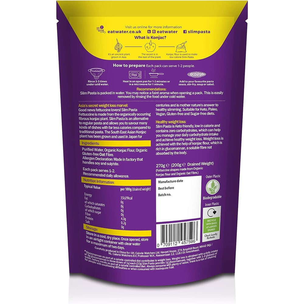 The fettuccine you love ? minus all the carbs! It looks like fettuccine, it tastes like fettuccine, but Eat Water Slim Pasta Fettuccine is so much more. This organic; zero-carb and low-calorie alternative to regular fettuccine will satisfy your strongest pasta cravings. Eat Water also sell zero-carb alternatives to lasagne, noodles, spaghetti, fettuccine and rice and reduced carb panang, pad thai, arrabbiata and tarka dal ready meals ? a carb for every craving!