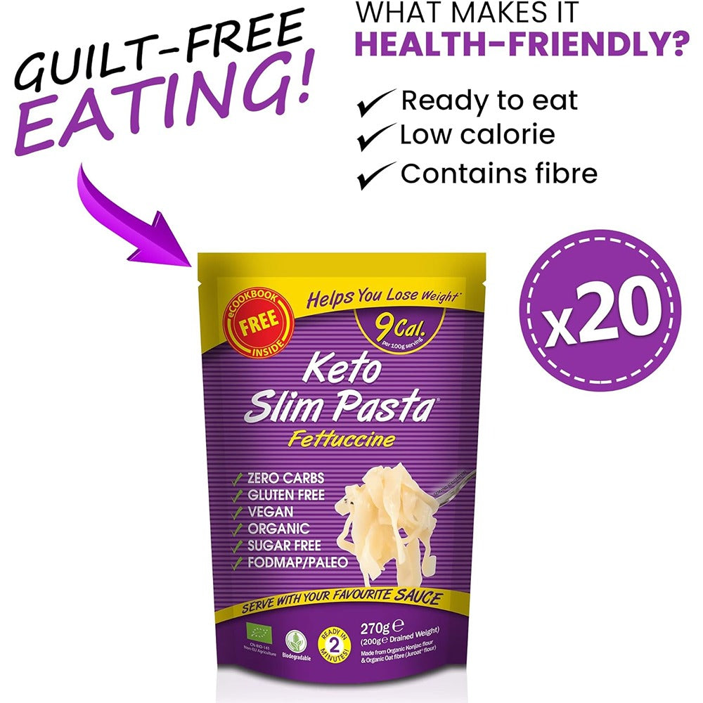 - A GREAT SOLUTION FOR WEIGHT WATCHERS, DIETARS, VEGANS, VEGETARIANS, DIABETICS, IDEAL FOR KITO, ATKINS, PALEO, LCHF & DUKAN DIET ? Slim Pasta Fettuccine is 100% organic and vegan. It makes a great alternative for those living with diabetes due to it?s zero carb and no sugar content. Great for weight control and Kito and diets