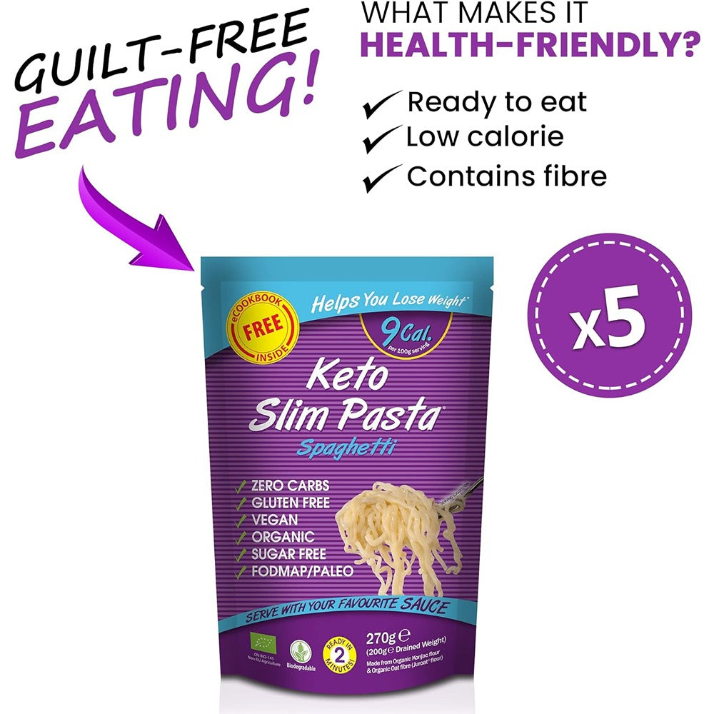 Organic Slim Pasta Spaghetti is a konjac plant-based alternative to regular spaghetti that is scientificailly providen for weight loss. It is also zero in Carbohydrate, 9 calories per 100g, Keto friendly, Vegan, Gluten-Free, Fat-Free and Sugar-Free.