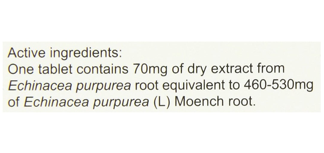 IngredientsEach tablet contains 70mg of dry ethanolic extract equivalent to 460-530mg Echinacea purpurea root. It also contains other non-active ingredients. These ingredients are: Herbal extract: Maltodextrin; Silica colloidal hydrated. Tablet core: Calcium hydrogen phosphate dihydrate; Cellulose microcrystalline; Silica colloidal hydrated; Croscarmellose sodium and Magnesium stearate.
