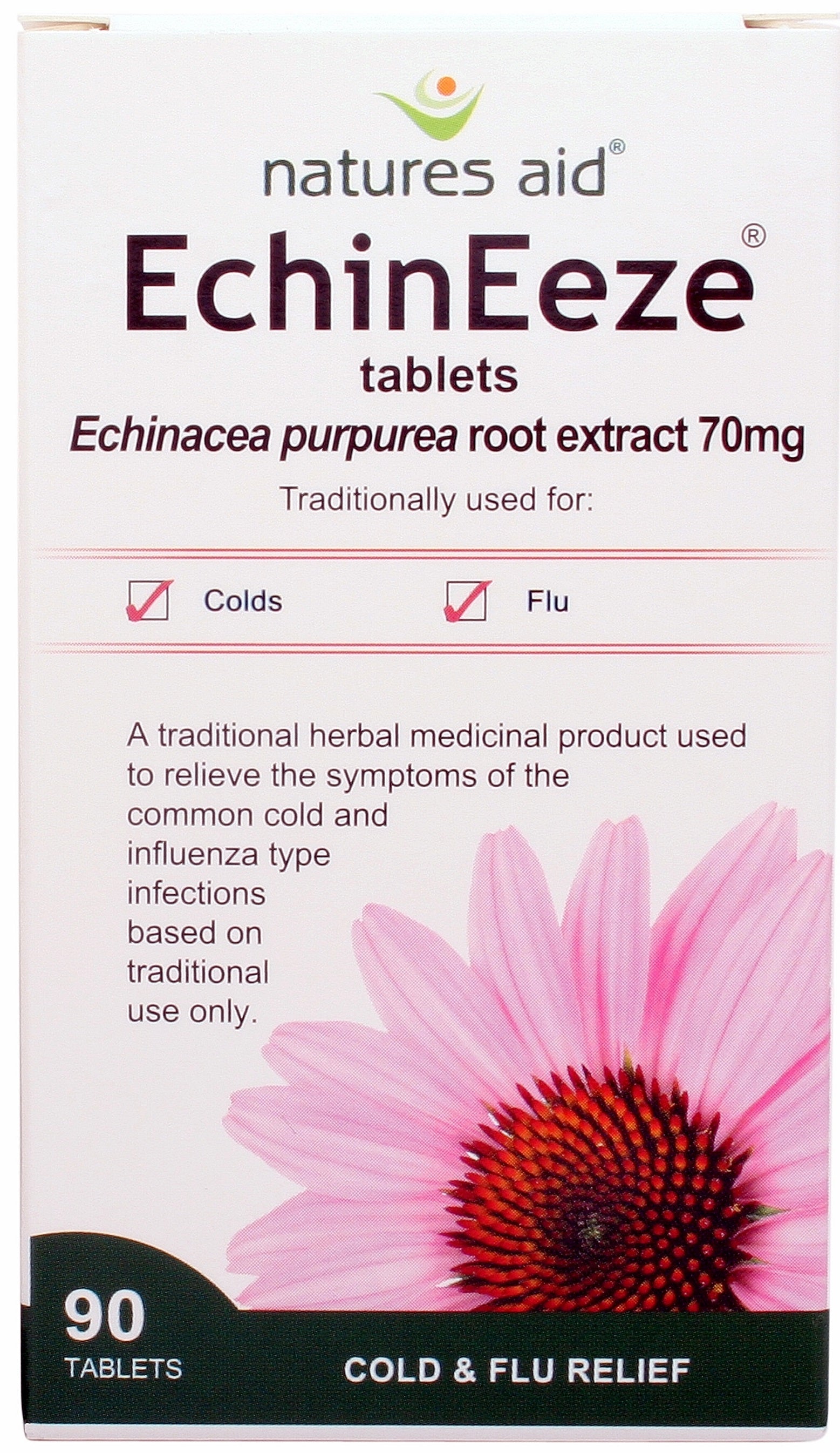 EchinEeze is a traditional herbal medicinal product used to relieve symptoms of the common cold and influenza type infections based on traditional use only. Ingredients: Each tablet contains 70mg of dry ethanolic extract equivalent to 460-530mg Echinacea purpurea root. It also contains other non-active ingredients. These ingredients are: Herbal extract: Maltodextrin; Silica colloidal hydrated. Tablet core: Calcium hydrogen phosphate dihydrate; Cellulose microcrystalline; Silica colloidal hydrated; Croscarmellose sodium and Magnesium stearate.