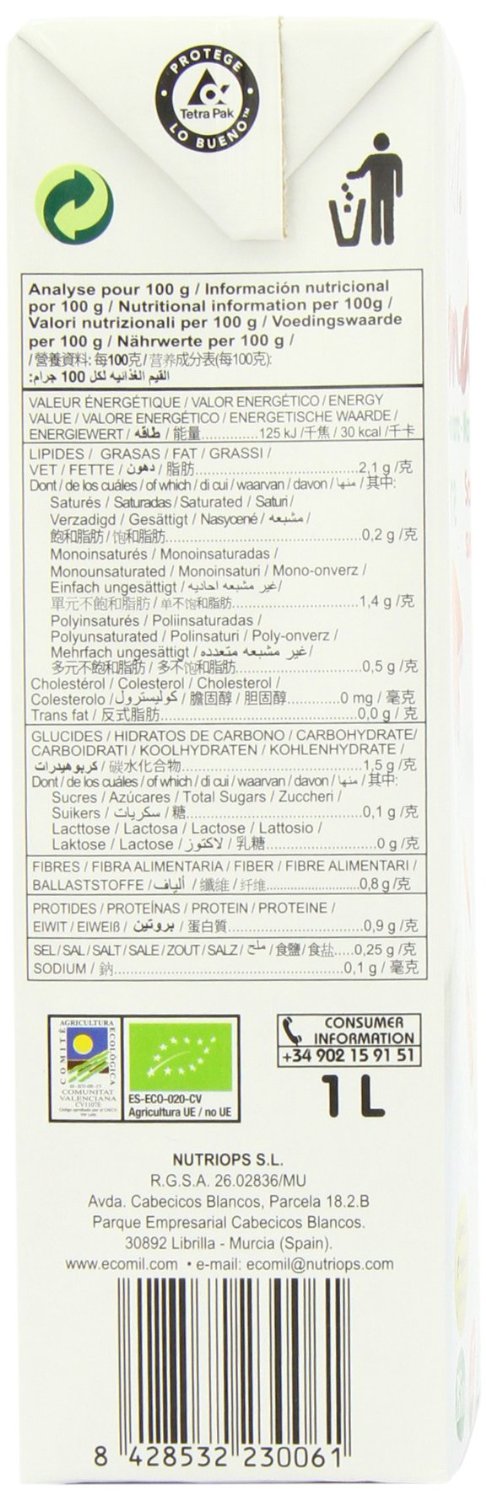 Ecomil Almond Nature Milk is a particularly good source of protein containing all the essential amino acids. Almond is a perfect alternative to dairy or soya milks in almost all preparations in coffee tea with cereals in baking for sauces or as a cold refreshing or hot drink by itself. This drink is delicious light and easy to digest. It is suitable for all kind of special diet requirements. Available 6 packets of 1 litre each.