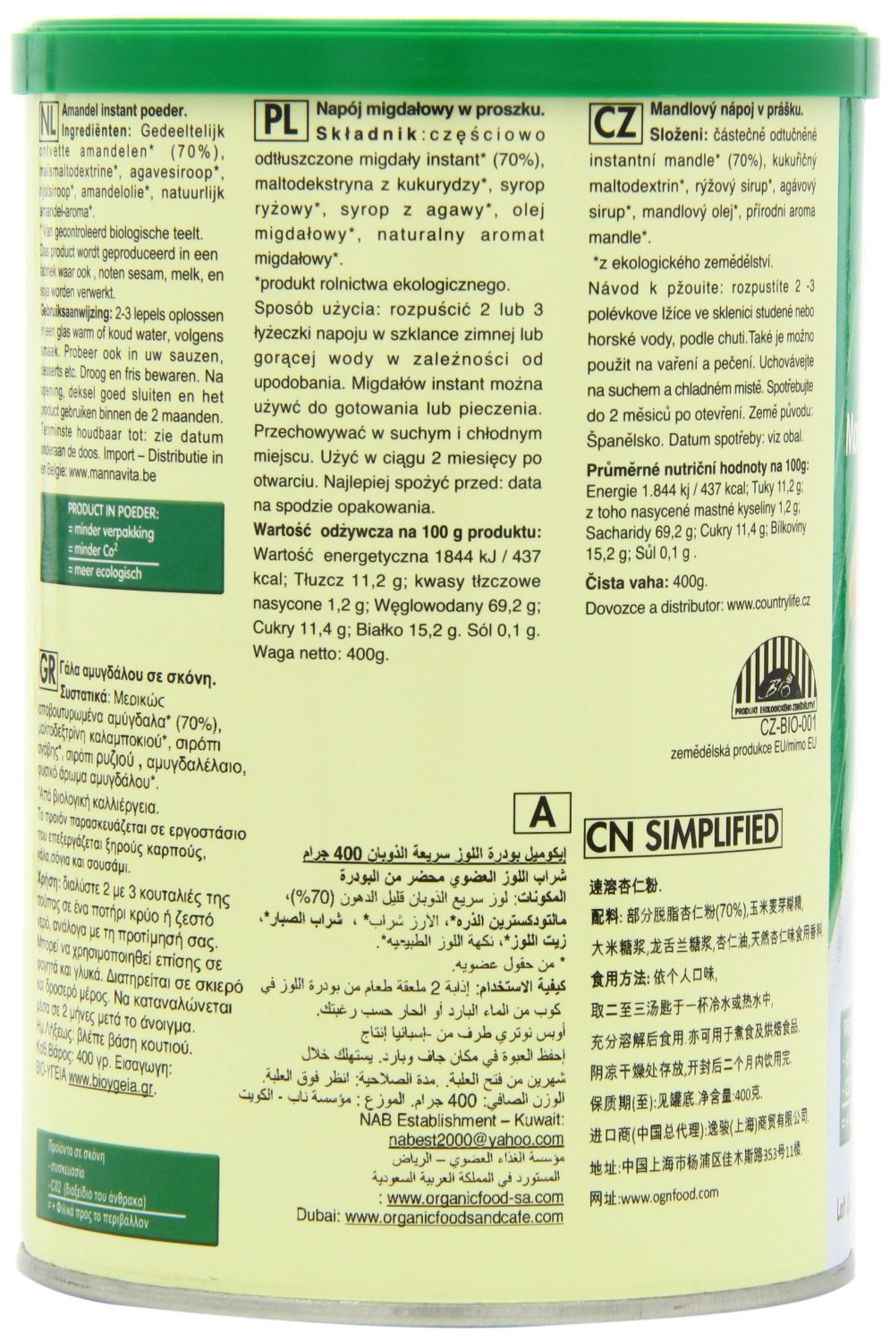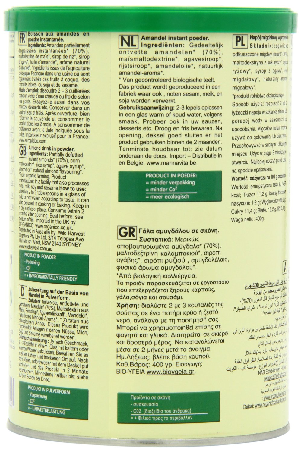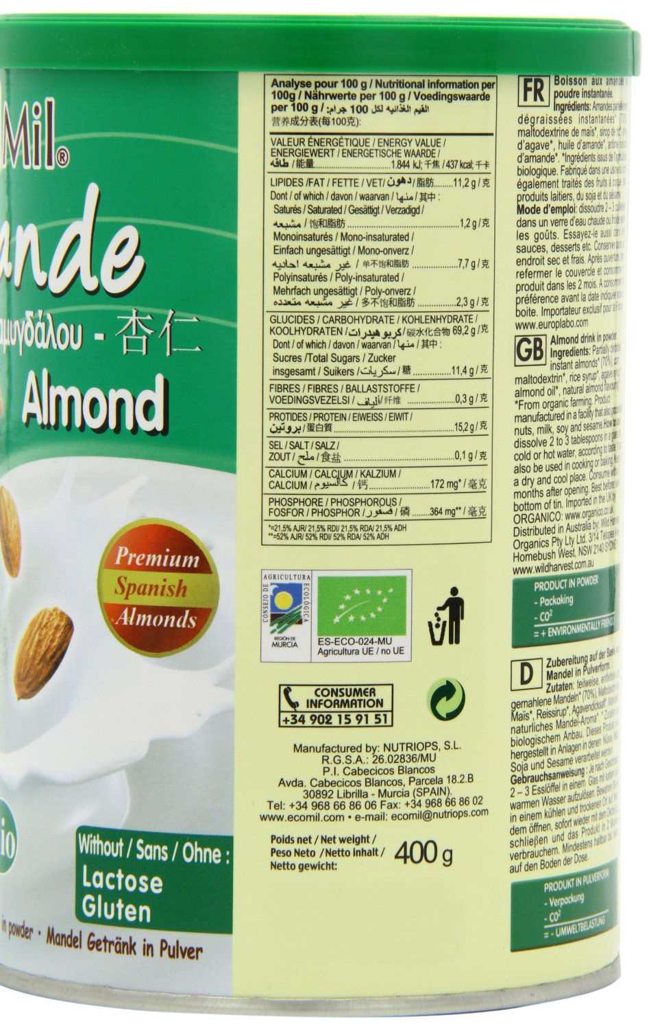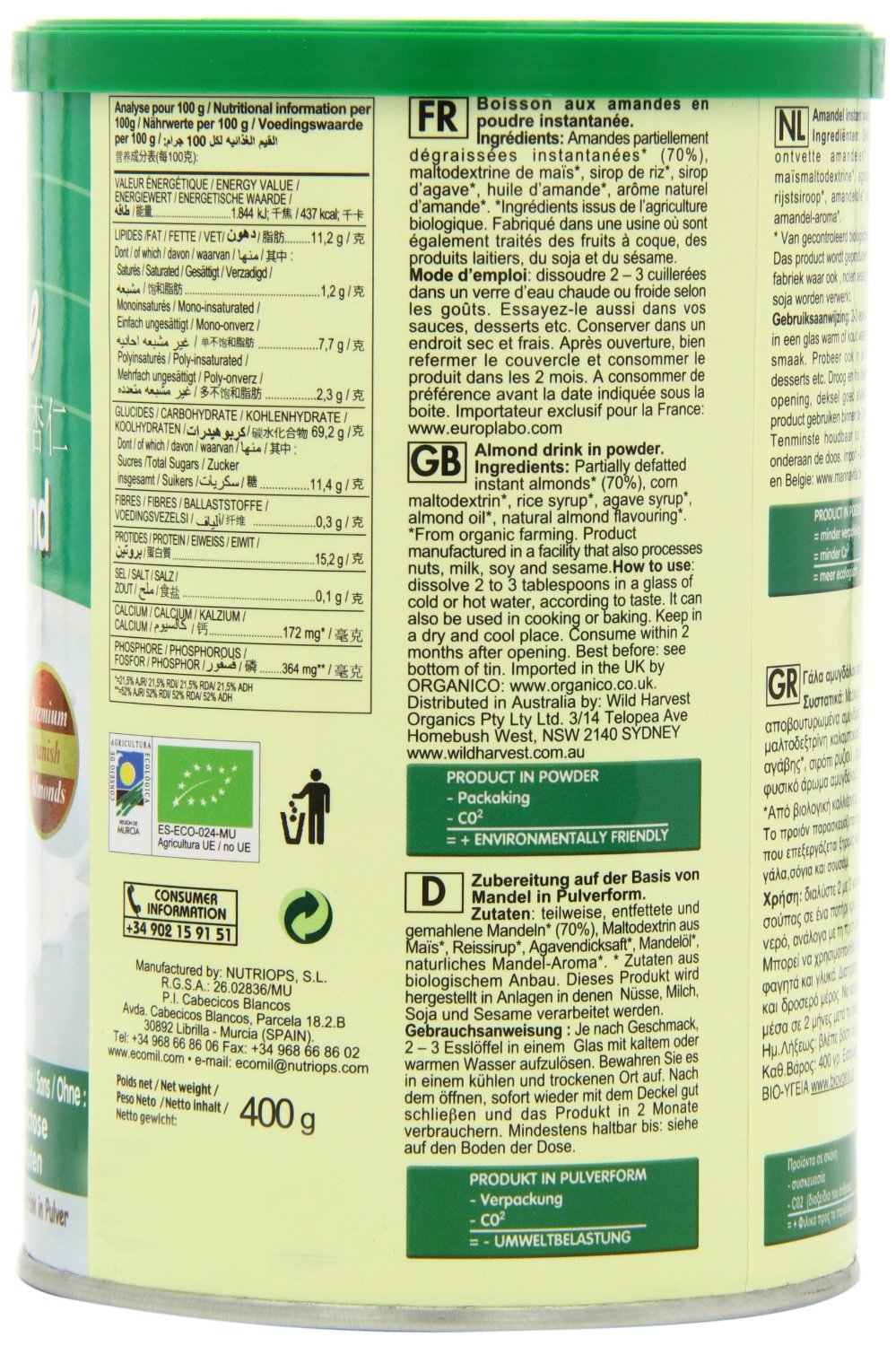 IngredientsPartially defatted instant ALMONDS* (60%), corn maltodextrin*, rice syrup*, agave syrup*, pea protein*, ALMOND oil*, natural ALMOND flavouring*. * From organic farming.