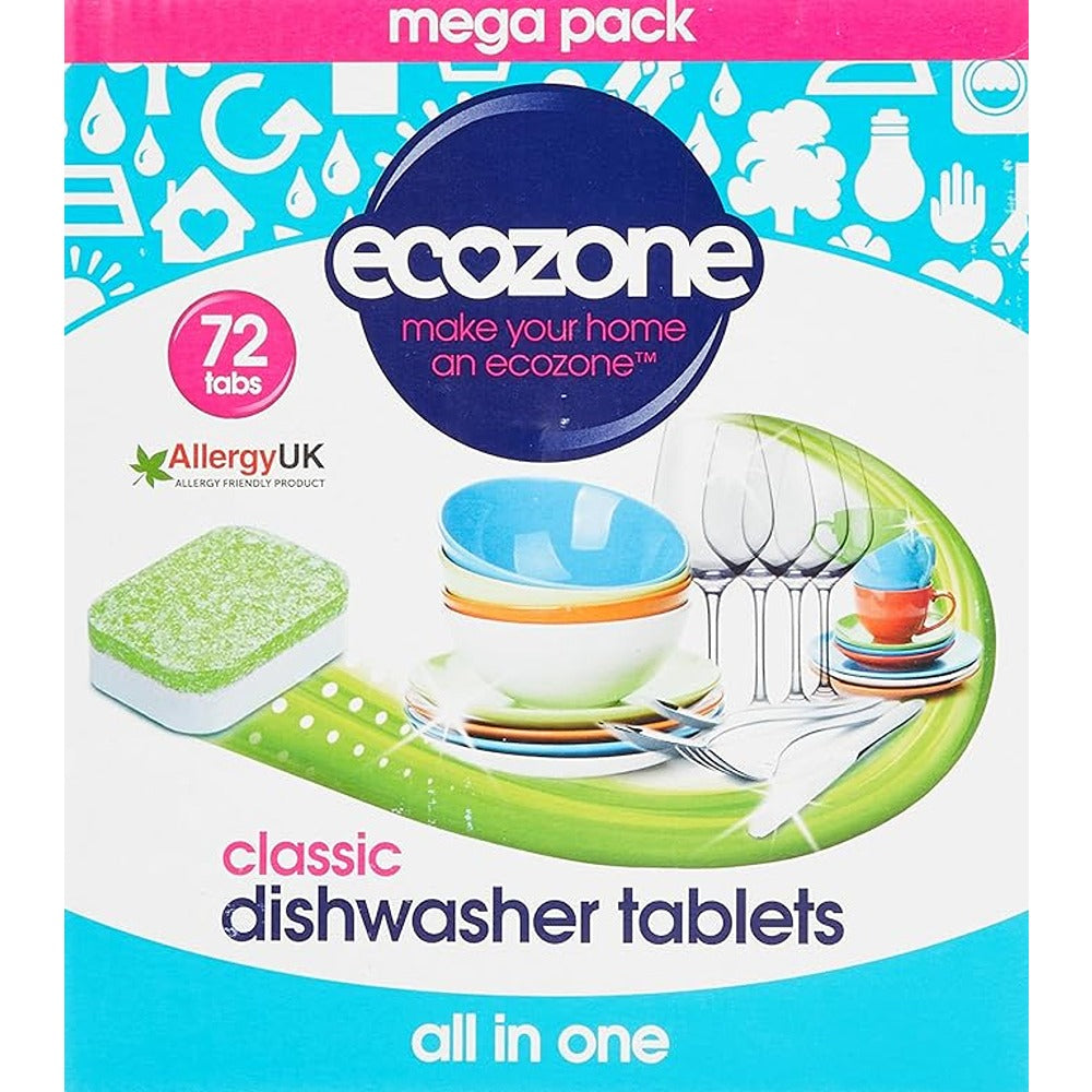 - Ecozone Classic All-In-One Dishwasher Tablets: 72 plant-based eco-friendly dishwasher tablets. Powerful cleaning action leaves dishes, plates, cups, cutlery, pans and glasses shiny and streak free