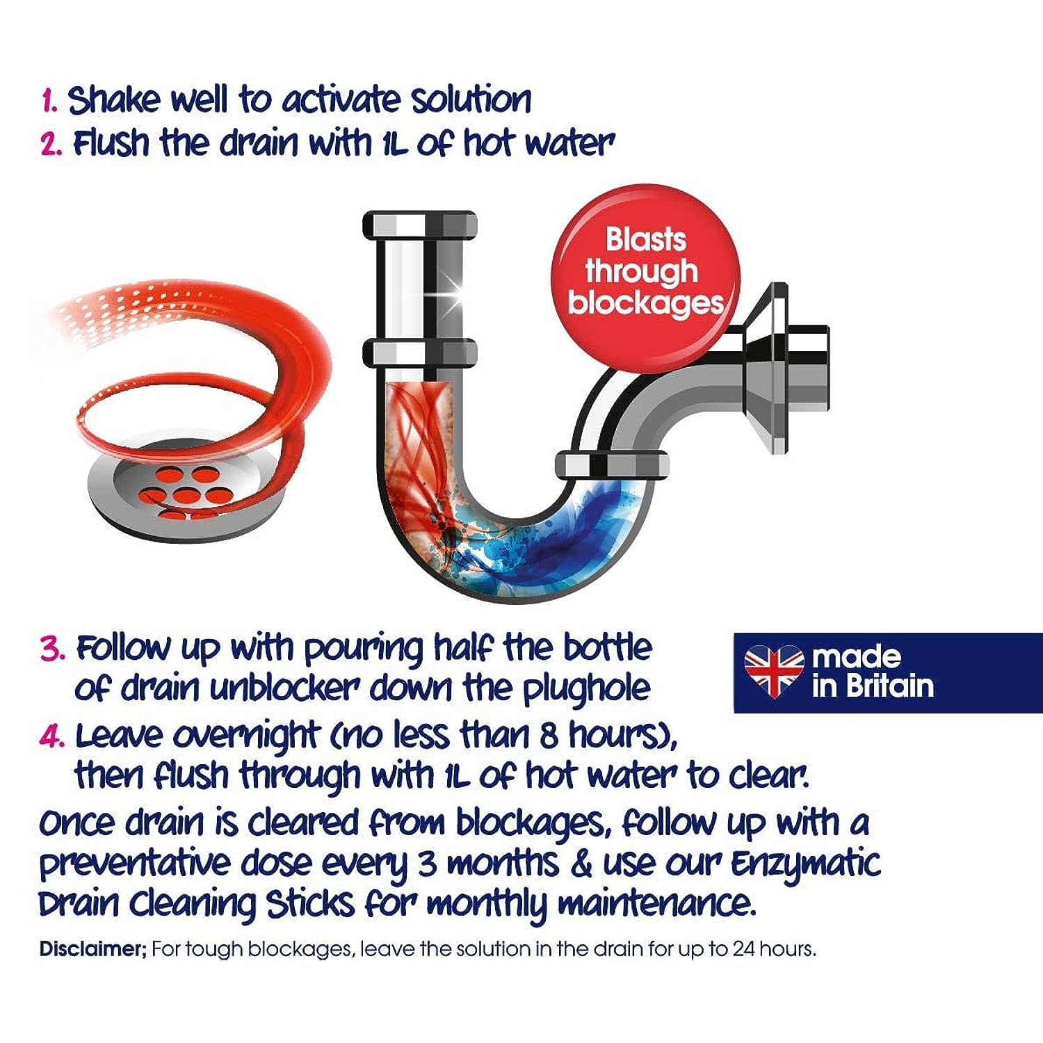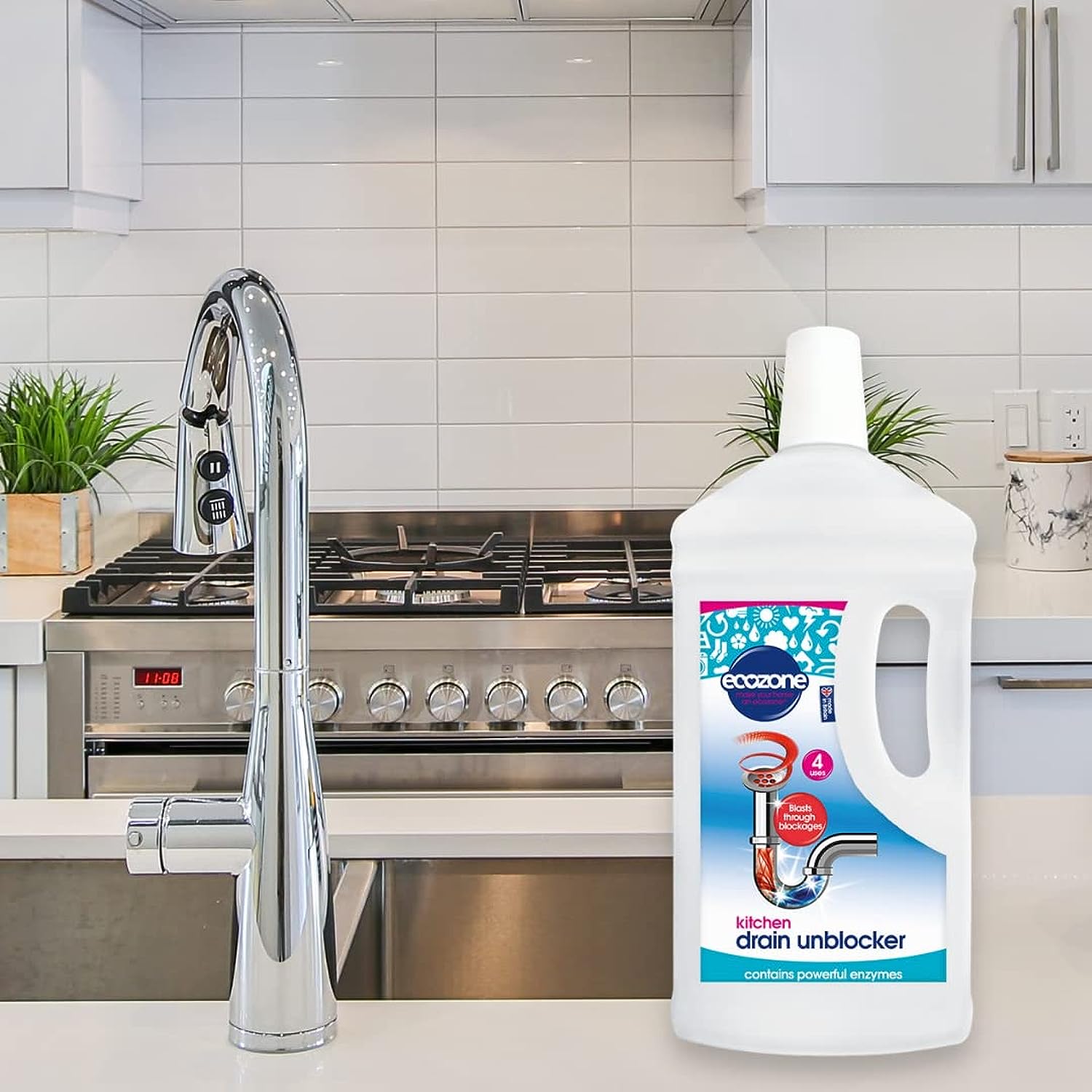2 applications per bottle. Ecozone Drain Unblocker is an enzyme based treatment for blocked drains. It contains specially developed enzymes that slowly eat away through tough blockages. The advanced formula actively breaks down fat, food, soap, grease, toilet paper and organic residues to cut through blockages in the kitchen, bathroom and toilet. The scientifically proven enzyme formula will clear most blockages without damaging your plumbing or septic tank. Note: This is Not a corrosive acid based unblocker that can provide instant results, dissolve hair and damage your pipes. Used regularly, this product will maintain a free-flowing drain. If you have a seriously blocked drain Ecozone recommends to contact a plumber as opposed to using highly toxic products that are harmful to you and aquatic life.