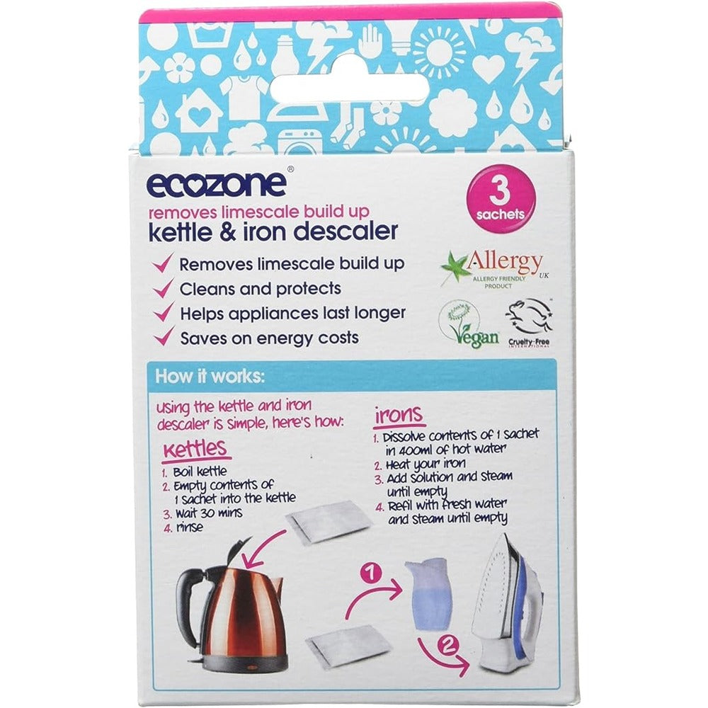 Ecozone Kettle & Iron Descaler has been specially formulated to effectively remove lime scale deposits without toxic chemicals. By descaling regularly, your appliances will be lime scale free, work more efficiently and could reduce your electricity bills.Suitable for both Kettles and Irons, Ecozone formula will leave your appliances pristine, helping them to function better and prevent the problems associated with lime scale build up.