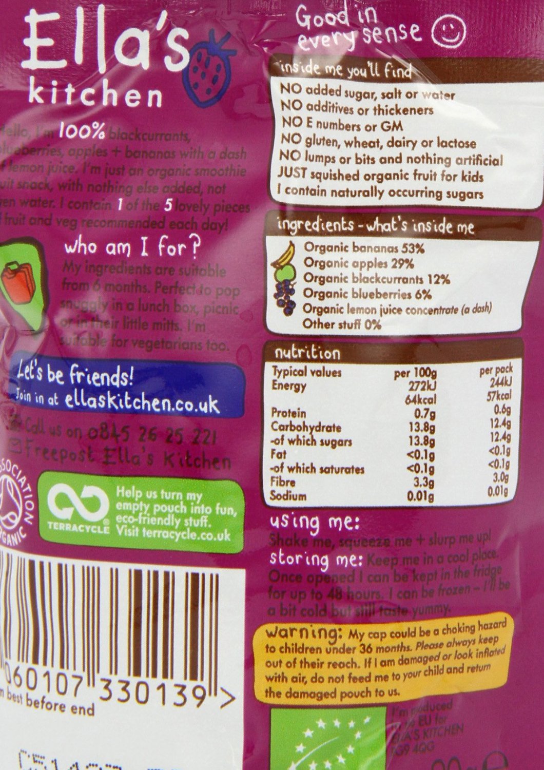 Ella's Kitchen organic fruit smoothie the purple one has blackcurrant and blueberry smoothie made from certified USDA organic fruits and a tiny dash of lemon juice. It is a scrumptious fruit smoothies for babies and toddlers. The ingredients and textures are suitable for babies from 6 months. It has no added sugar or salt and contains naturally occurring sugars. It has no additives or thickeners, E numbers or GM. It has no lumps and nothing artificial, just squished organic fruit for kids. It is free from lactose, gluten and suitable for vegetarian. It is available 12 pouches of each 90 grams.