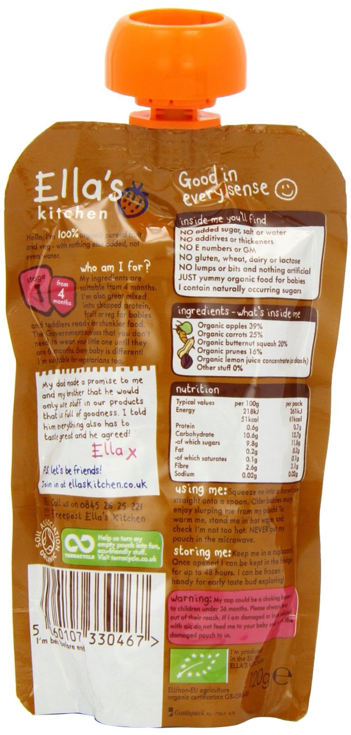 Ella's Kitchen organic apples carrots prunes with butternut squash is perfect blend of tastes for tiny tots on a tastebud journey. There are so many yummy flavours in this mix, including delicious butternut squash puree. Squash puree and prune puree gently mixed with apple and carrot purees too. It all comes in a resealable pouch your baby will love to hold and slurp. It has no added sugar or salt and contains naturally occurring sugars. It has no big lumps and nothing artificial. It is suitable for babies from 4 months. It is available 7 pouches of 120 g each.