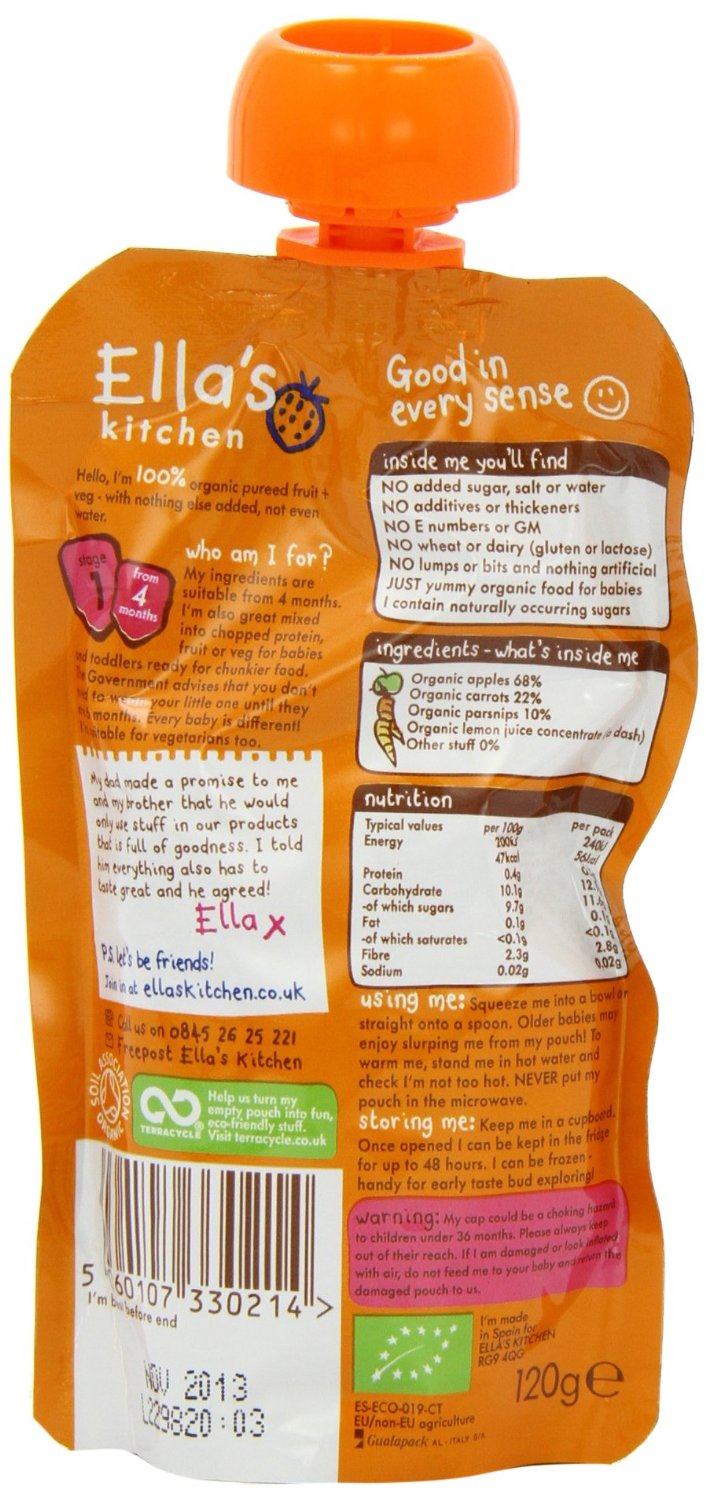 Ella's Kitchen carrots, apples and parsnips smoothie is a gentle mix of carrot puree, parsnip puree and apples makes carrots apples with parsnips a yummy meal for little eaters trying out new tastes. It's add nothing except a tiny splash of lemon juice, not even water. We pack this delicious certified USDA organic carrot, apple and parsnip puree into a convenient resealable pouch. It has no added sugar, salt or water and contain naturally occurring sugars. It has no lumps or bits and nothing artificial, just yummy organic food for babies. It is suitable for babies who follow a gluten and lactose free diet. It is suitable for vegetarians. It is available 7 pouches of 120 g each.