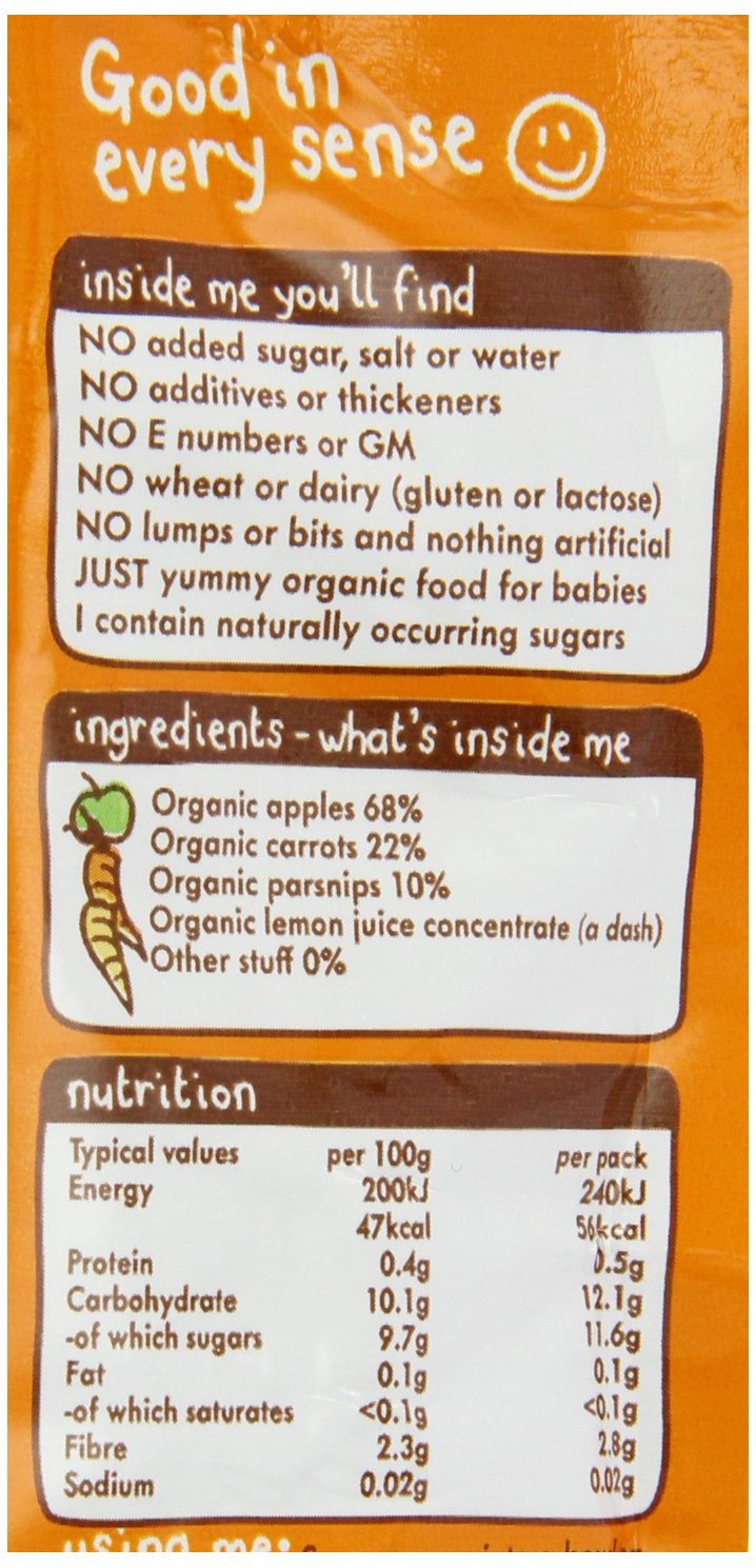 IngredientsOrganic Apple Puree, Organic Carrot Puree, Organic Parsnip Puree, <1% Organic Lemon Concentrate.