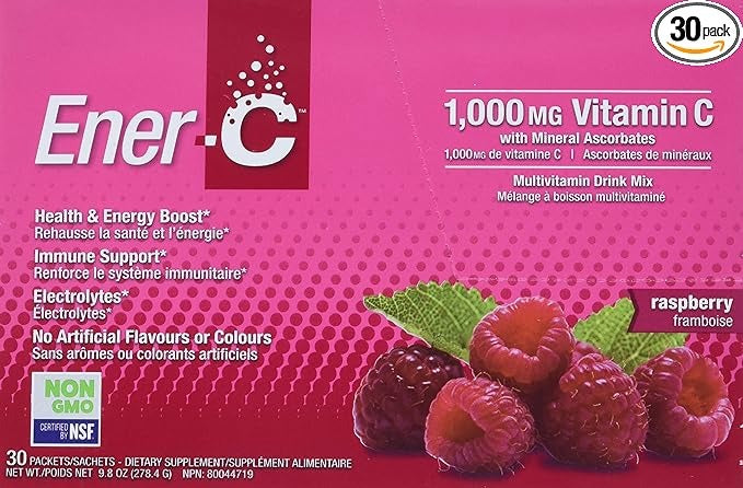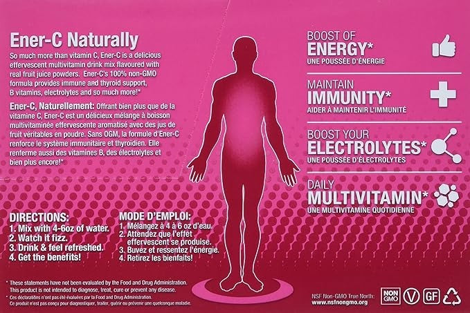 Ener-C is a Non-GMO Certified effervescent multivitamin drink mix in convenient dose sachets. Containing 1000mg of Vitamin C plus essential vitamins and minerals.Ener-C contains natural fruit juice powders and is free from artificial flavors, colors, and sweeteners. It is suitable for vegans and vegetarians and is free from gluten, lactose and dairy.