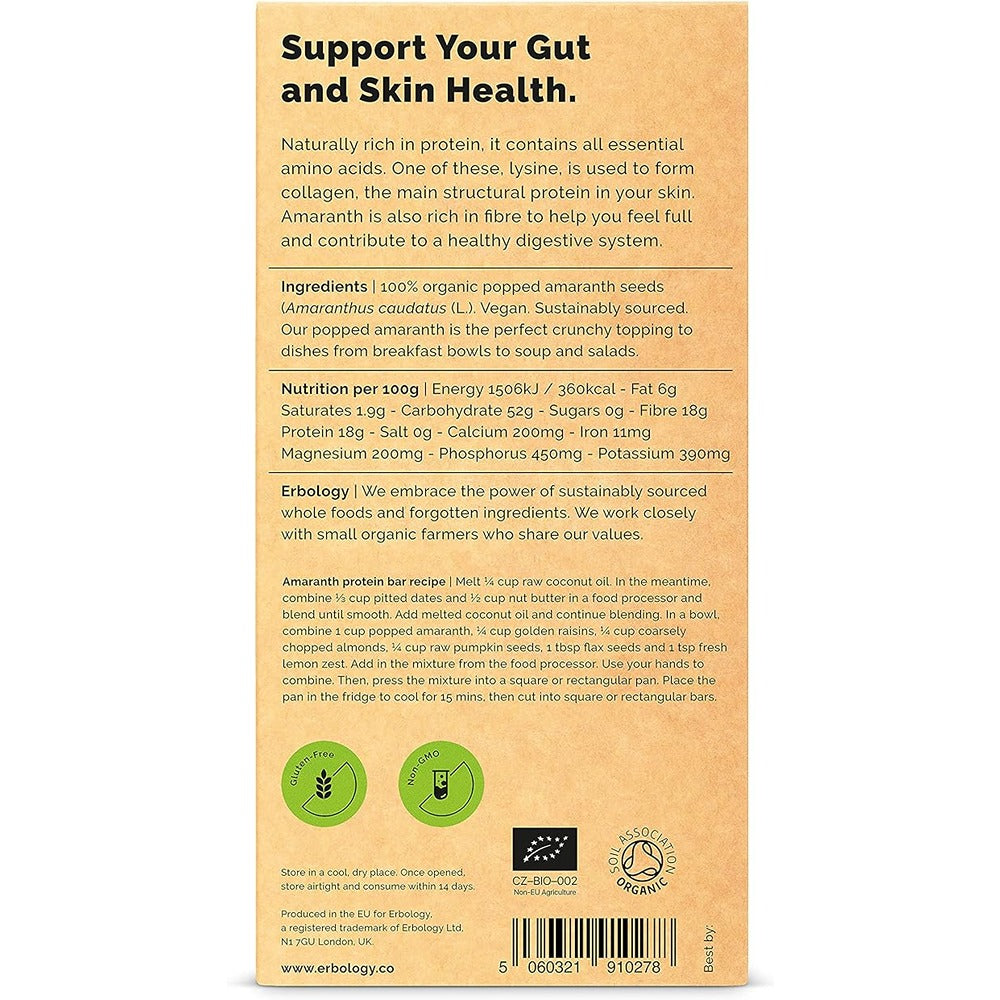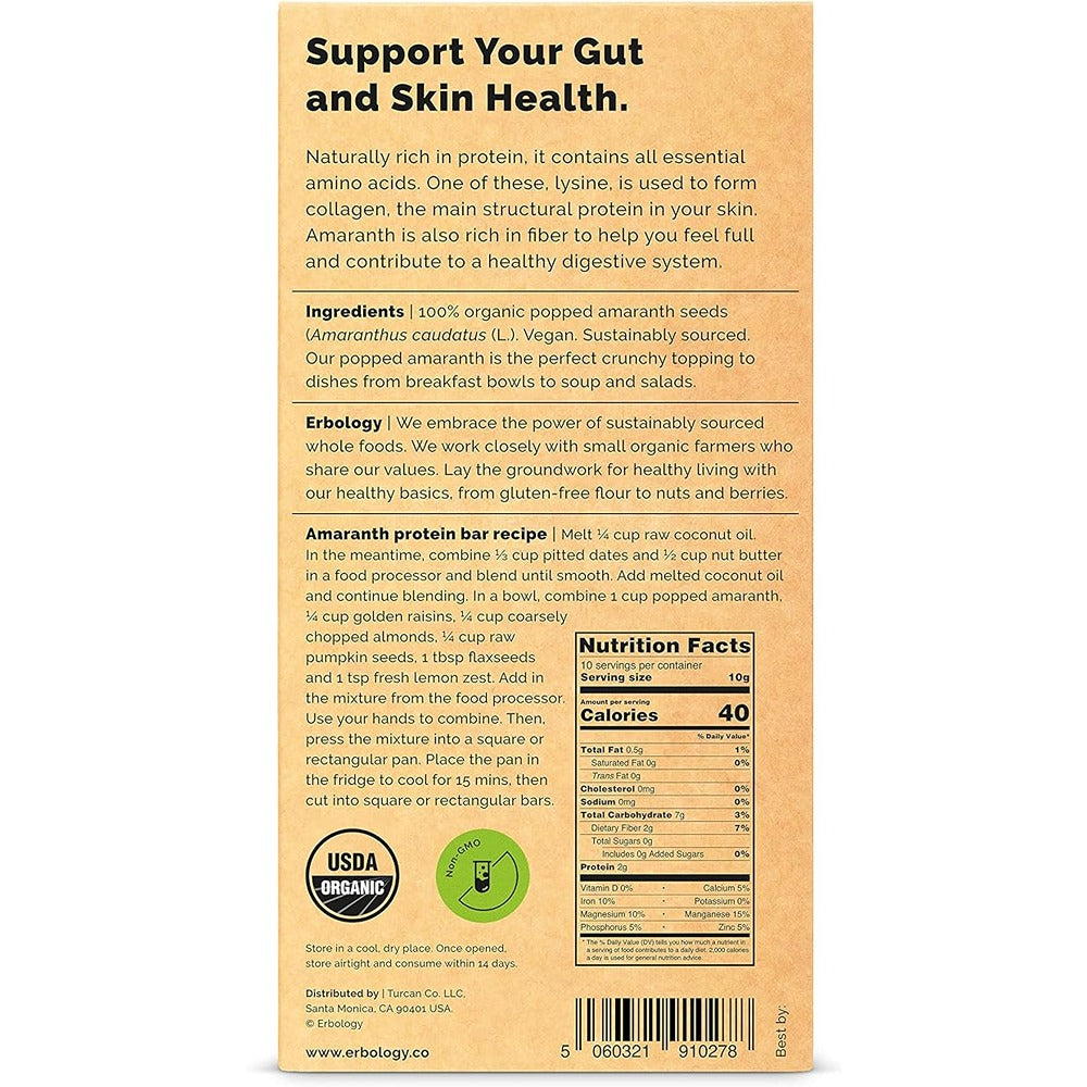 Erbology Organic Amaranth Pops is delicious nutty topping high in fibre and protein. Amaranth is a unique plant. It's rich in fibre and contains all the essential amino acids, which is rare among plants. This light nutty delight is naturally gluten-free. It is also an excellent source of dietary fibre, minerals and high-quality protein. Amaranth contains all nine essential amino acids, including lysine. Among other things, your body uses lysine to form collagen, the main structural protein in your skin.