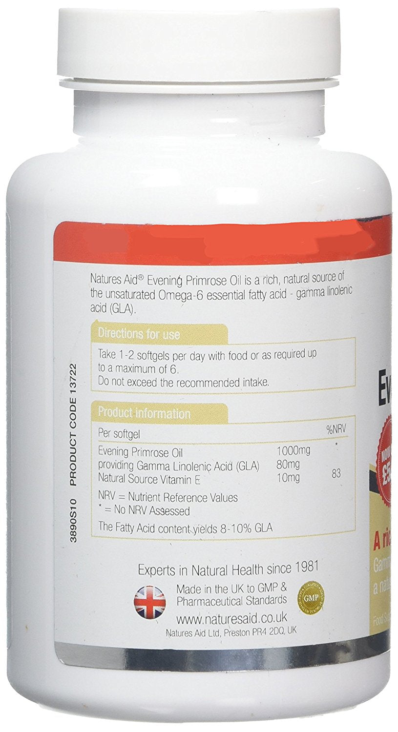 The Natures Aid 1000mg Cold Pressed Evening Primrose Oil Capsules are rich, a natural source of the unsaturated omega-6 essential fatty acid gamma linolenic acid (GLA) with each capsule providing a guaranteed 8-10 percent GLA. With natural source vitamin E. Available in 180 capsules.