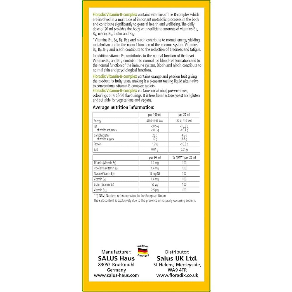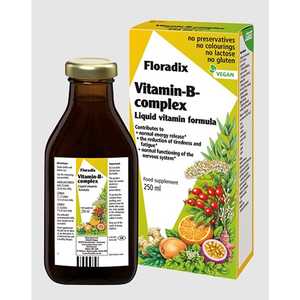 Liquid formula containing vitamins of the B-complex. Contributes to normal energy release, the reduction of tiredness and fatigue and to the normal functioning of the nervous system. Contains no alcohol, preservatives, colourings or artificial flavourings. Free from lactose, yeast and gluten and suitable for vegetarians and vegans. Floradix Vitamin-B-complex contains vitamins of the B-complex which are involved in a multitude of important metabolic processes in the body and contribute significantly to general health and wellbeing. The daily dose of 20ml provides the body with sufficient amounts of vitamins B1, B2, niacin, B6, biotin and B12.