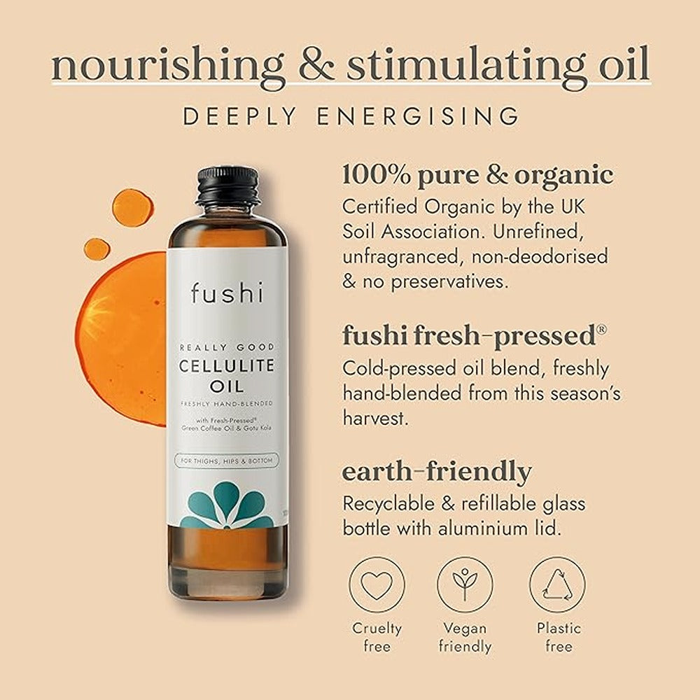 Fushi Really Good Cellulite Oil helps reduce the appearance of cellulite, boosts circulation, tones and firms and promotes smoother looking skin. It has been formulated with a potent blend of effective, stimulating and circulation-enhancing ingredients. Gotu kola, one of the most renowned Ayurveda herbs and known for its superb circulatory benefits, has been triple infused to provide triple strength. This has been combined with stimulating and diuretic green coffee bean oil, vitamin-rich, nourishing wheat germ oil, Vitamin E, detoxifying sweet birch and cleansing grapefruit essential oil. Made with over 85 percent organic ingredients and free from paraffin, BHT, benzyl salicylate artificial perfumes and colours.