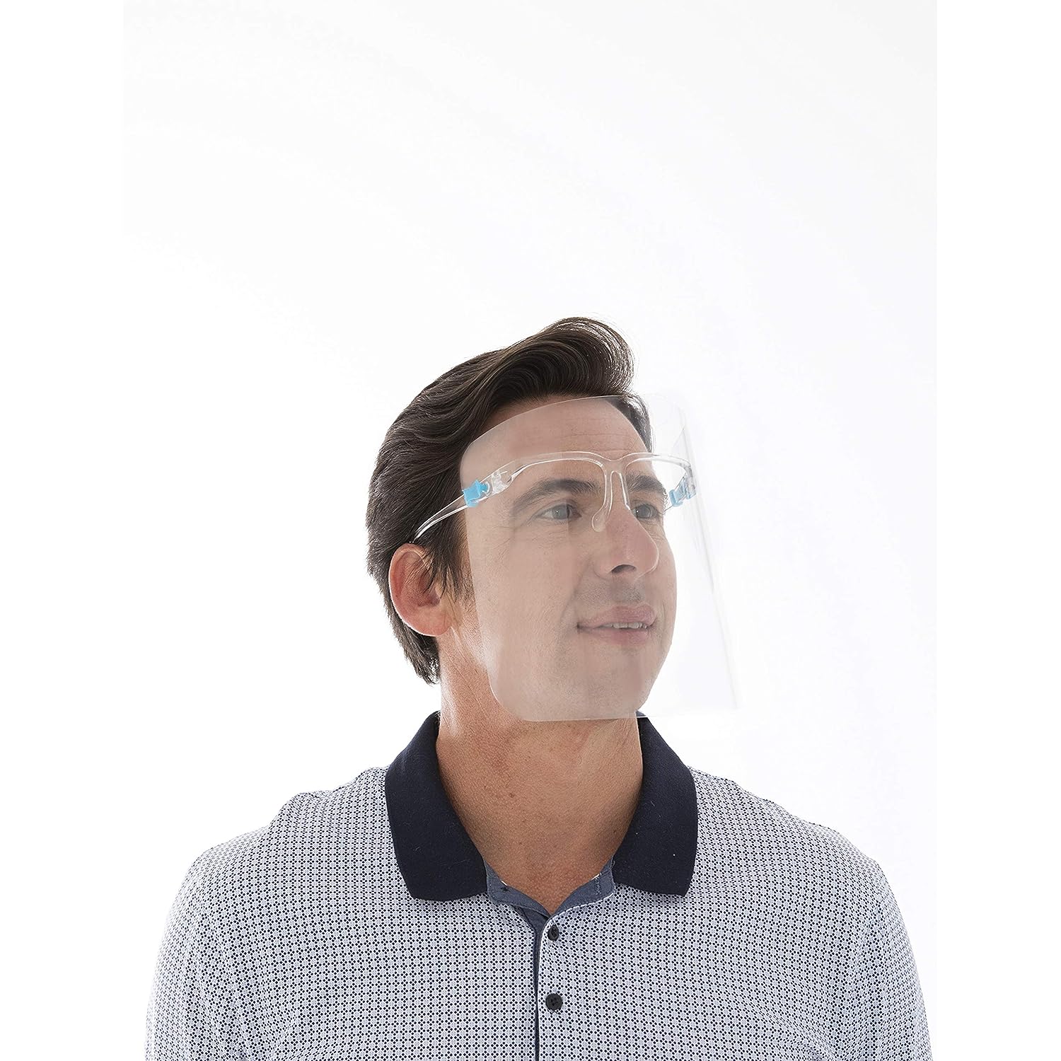 Product description Staying healthy is everyone’s priority, so this professional-standard face shield visor has come along at just the right time. Designed to offer an advanced level of protection to the eyes as well as the mouth and nose, it acts as an effective barrier against airborne droplets carrying bacteria and viruses as well as aerosols, sprays and splashes. The wrap-around design shields the top and sides of the face while the integral support and shield fits comfortably over glasses and masks. Lightweight and comfortable, the visor face shield screen is made from transparent polycarbonate with double sided Anti-fog lens, Reusable and easily washable with either water or sterilising spray. When it comes to your health, you can’t afford to compromise. Size: H34xW28cm.