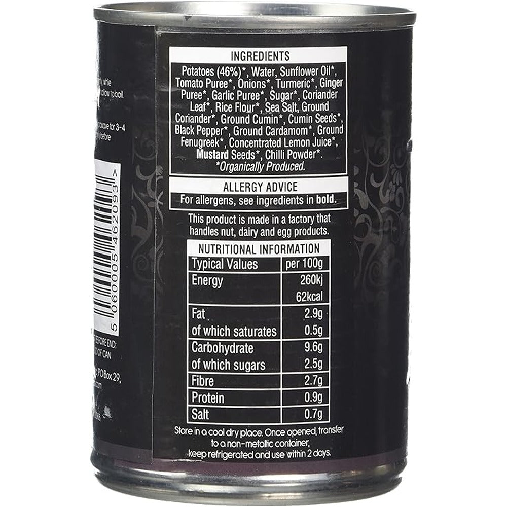 IngredientsPotato (45%), Water, Sunflower Oil, Onions, Tomato Puree, Curry Powder (Turmeric, Ground Coriander, Ground Cumin, Cumin Seeds, Black Pepper, Ground Cardamon, Ground Fenugreek, Chilli Powder) (2%), Ginger, Garlic, Sea Salt, Raw Cane Sugar, Rice Flour, Lemon Juice, Fenugreek, Mustard Seeds, Turmeric.