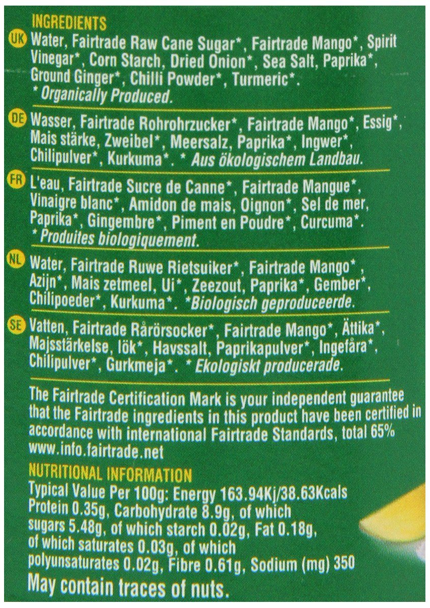 IngredientsRehydrated mangoes (50%), Sugar (39%), Water*, Dried onion, Corn starch, Sea salt*, Paprika, Ginger, Chilli, Tumeric (* = approved non-organic ingredient).