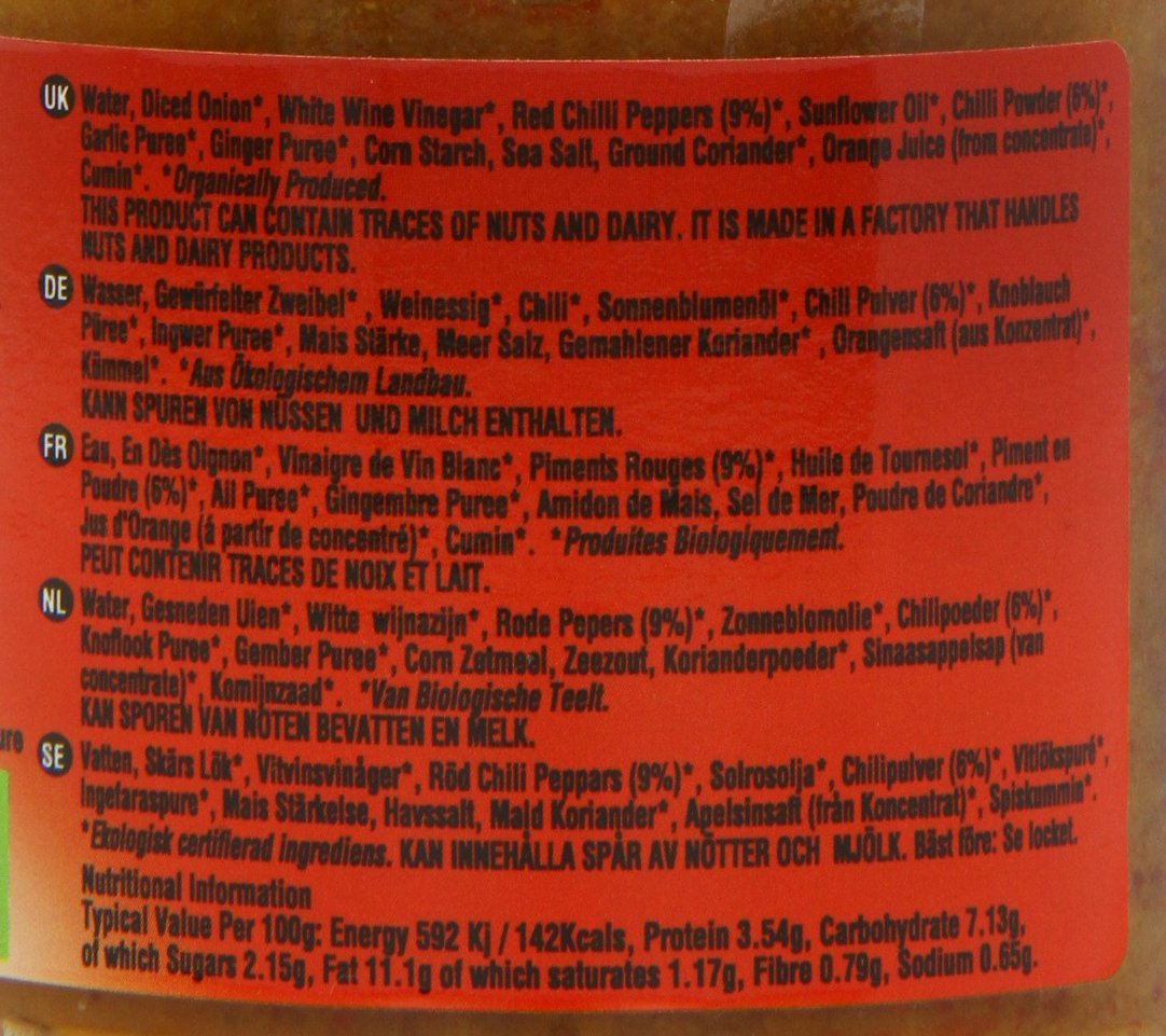 IngredientsWater, Diced Onions*, White Wine Vinegar* Red Chilli Peppers (9%)*, Sunflower Oil*, Chilli Powder (6%), Garlic Puree*, Ginger Puree*, Corn Starch, Sea Salt, Ground Coriander*, Orange Juice (from concentrate)*, Cumin*. *Organically Produced.