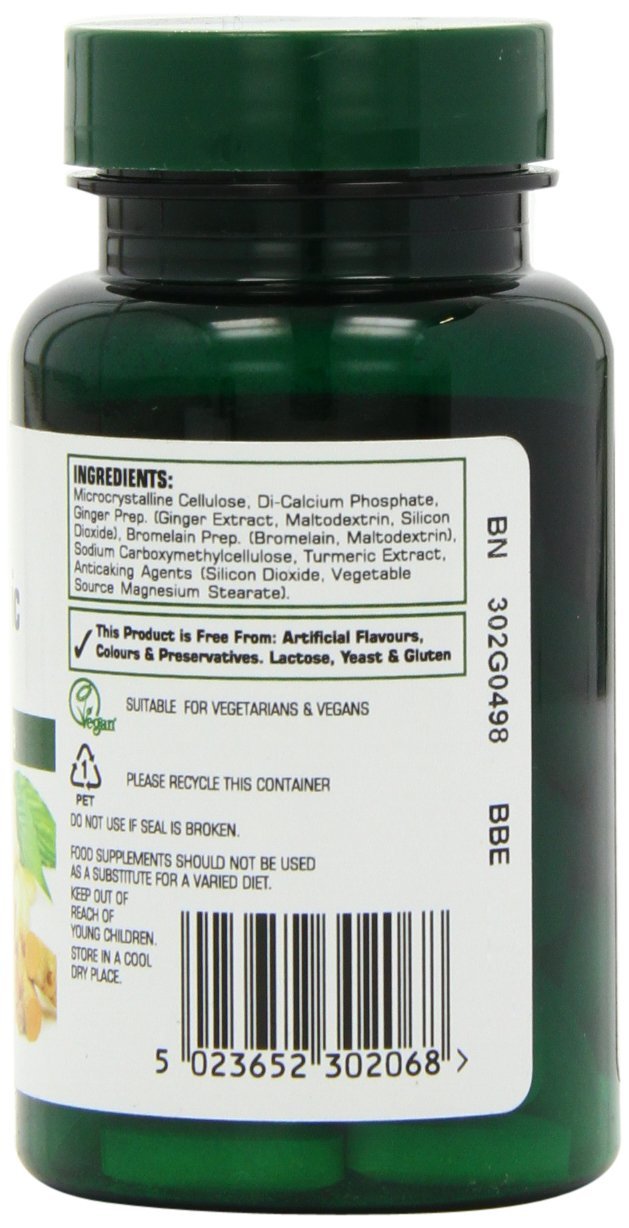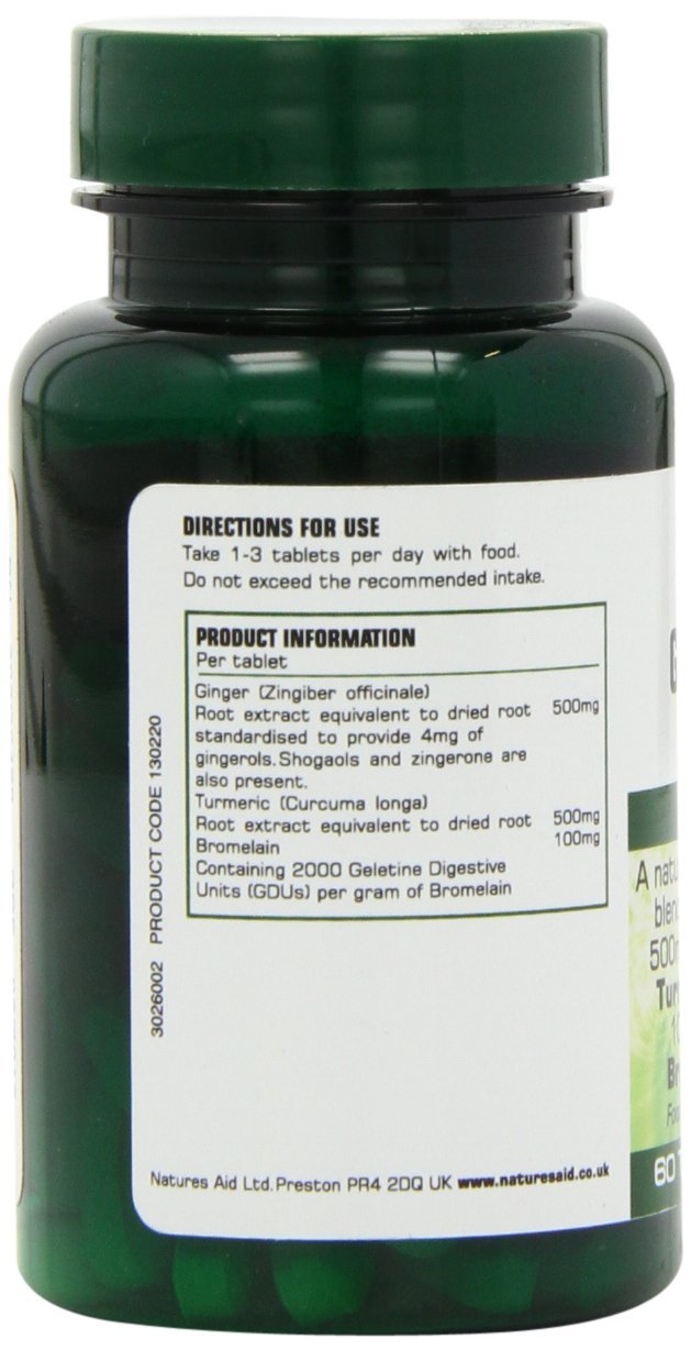 The Natures Aid Ginger Turmeric and Bromelain Tablets have a synergistic formula combining three remarkable botanical ingredients into one tablet. Provides 500mg ginger, 500mg turmeric and 100mg bromelain. Ginger has a long history of traditional use, spanning back over 2500 years. Turmeric is widely using in Chinese and Indian herbalism and has been the subject of vast amounts of research in recent years. Bromelain is the collective term for the enzymes derived from the ripe and unripe fruit and the stem and leaves, of the pineapple plant. These enzymes are reputed for their ability to digest proteins.