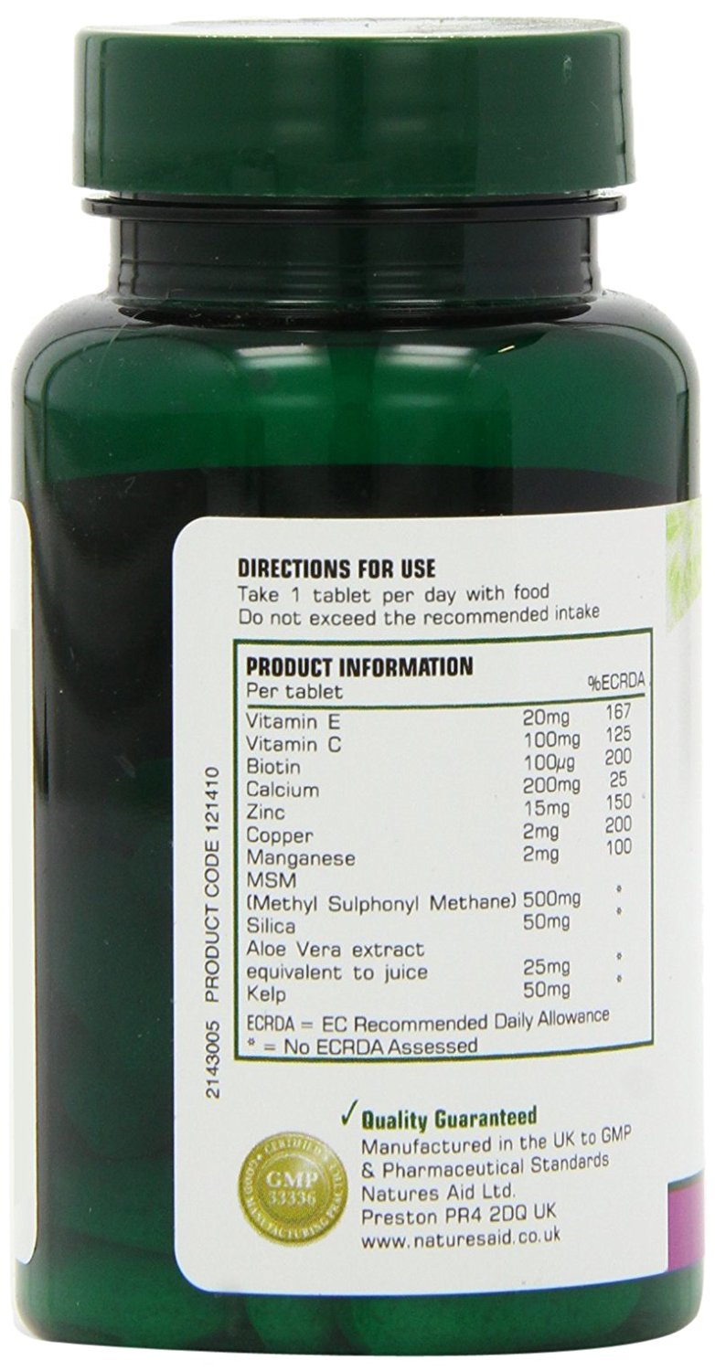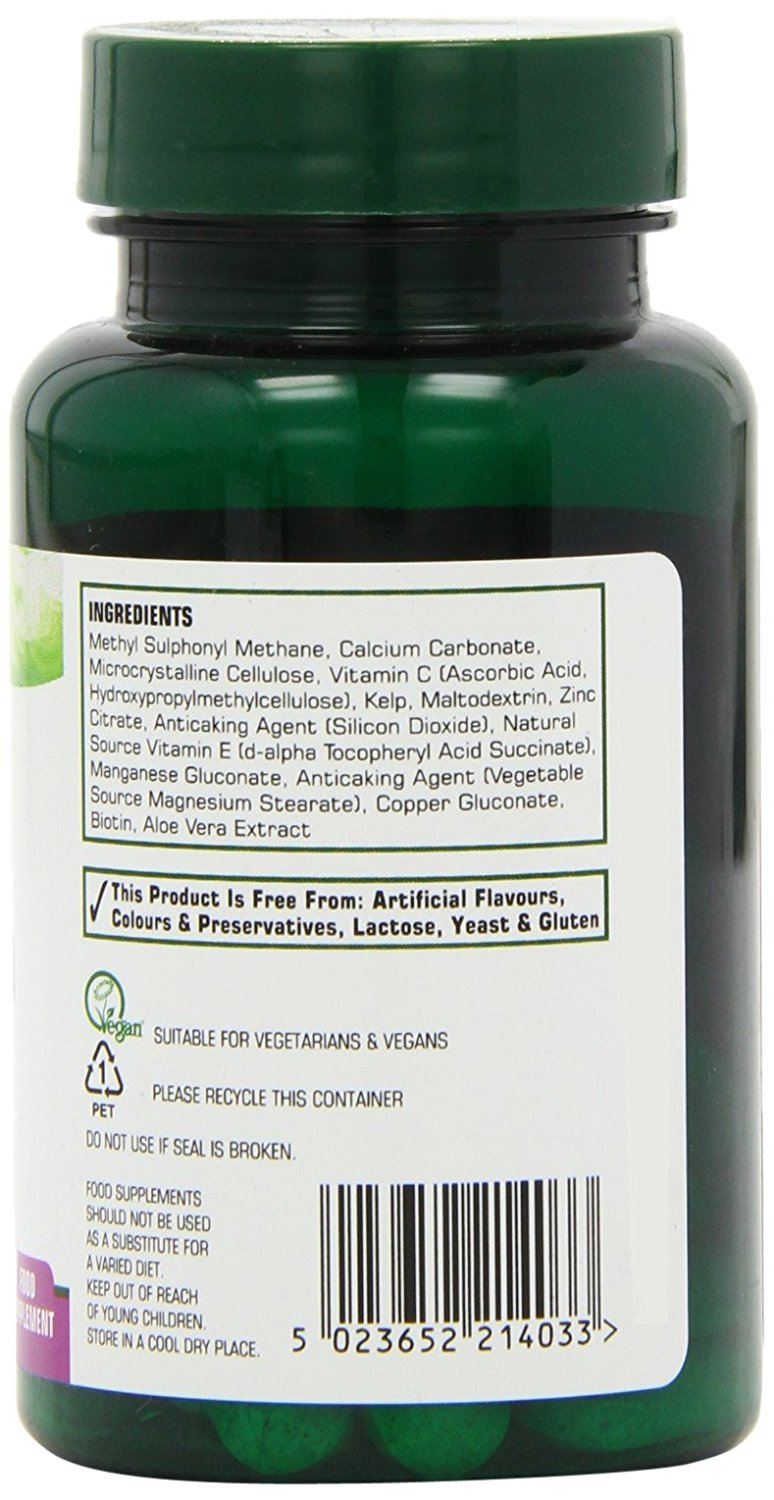 IngredientsMethyl Sulphonyl Methane, Calcium Carbonate. Microcrystalline Ceilulose, Vitamin C (Ascorbic Acid. Hydroxypropylmethylcellulose). Kelp. Maltodextrin, Zinc Citrate, Anticaking Agent (Silicon Dioxide). Natural Source Vitamin E (D-alpha Tocopheryl Acid Succinate - product of soya), Manganese Gluconate, Anticaking Agent 'Vegetable Source Magnesium Stearate). Copper Gluconate. Biotin. Aloe Vera Extract.