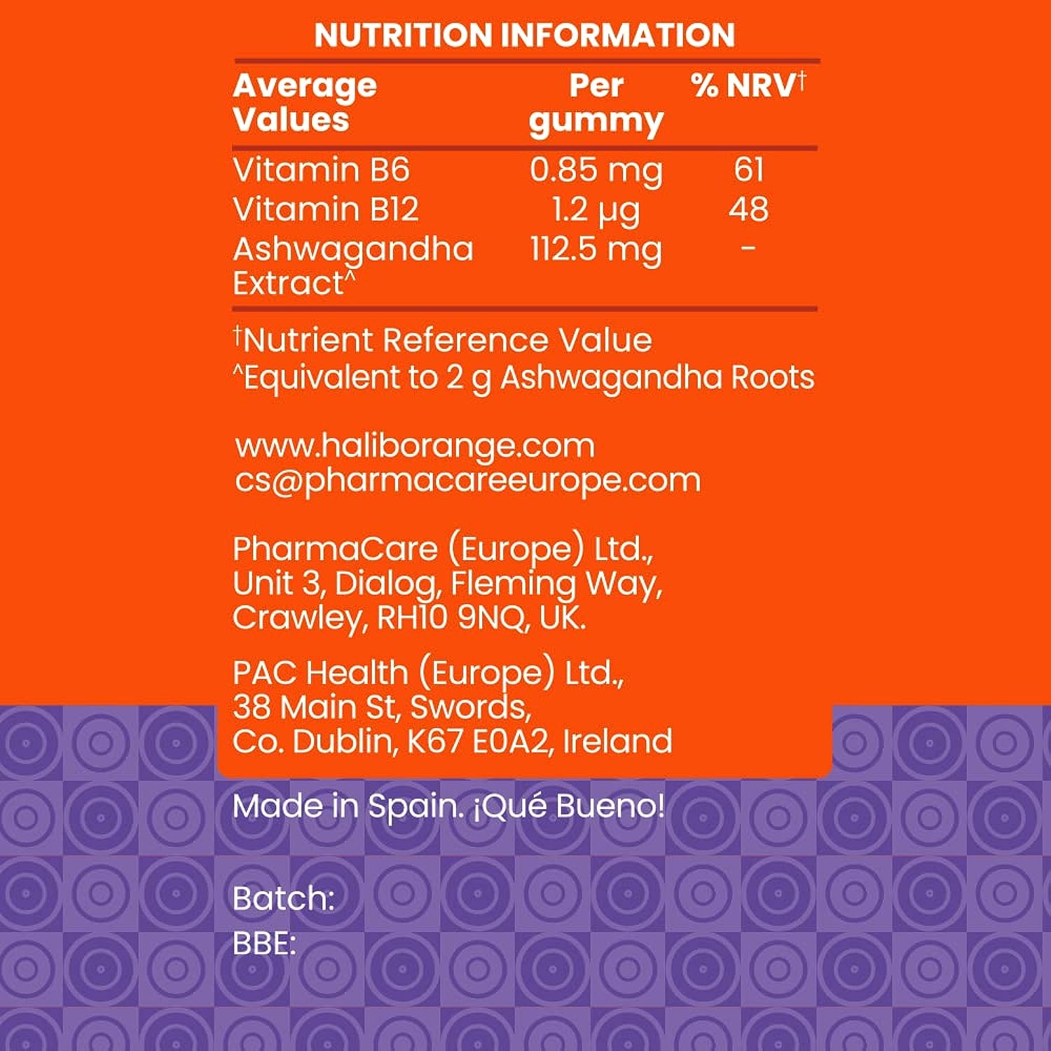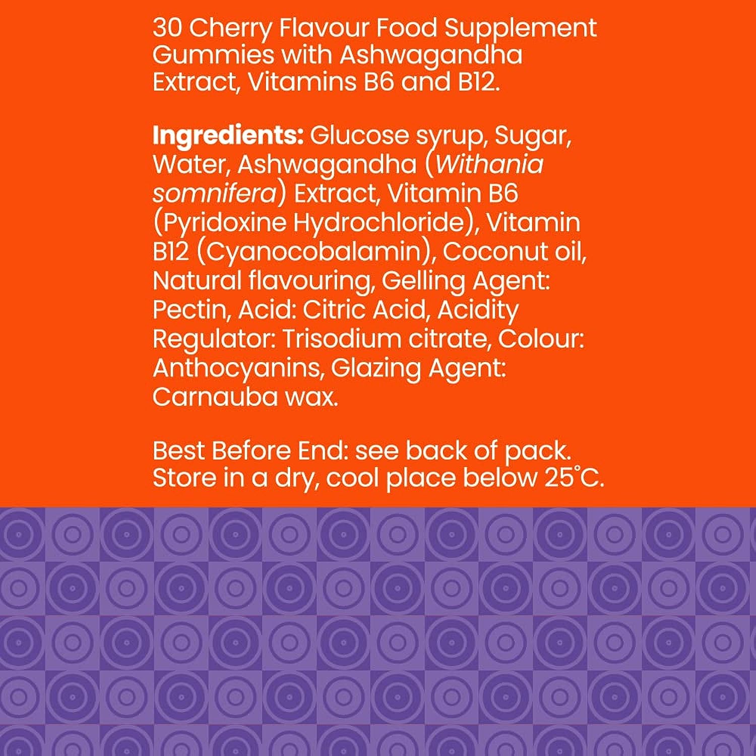IngredientsGlucose Syrup, Sugar, Water, Ashwagandha (Withania somnifera) Extract, Vitamin B6 (Pyridoxine Hydrochloride), Vitamin B12 (Cyanocobalamin), Coconut Oil, Natural Flavouring, Gelling Agent: Pectin, Acid: Citric Acid, Acidity Regulator: Trisodium Citrate, Colour: Anthocyanins, Glazing Agent: Carnauba Wax