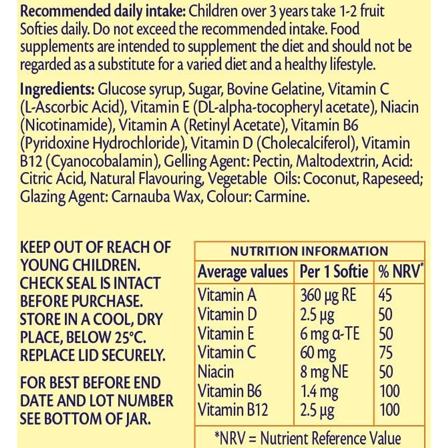 Haliborange Multivitamin Softies are a tasty way for your kids to get the essential nutrients they need everyday. Each yummy strawberry fruit softie contains 8 essential vitamins including Vitamin A, C & D which are recommended by UK Dept. of Health (Source: nhs.uk) Haliborange Multvitamin Softie is made lovingly for your little ones' to support everyday health. Children over three years can have upto 2 softies a day No artificial colours or flavours