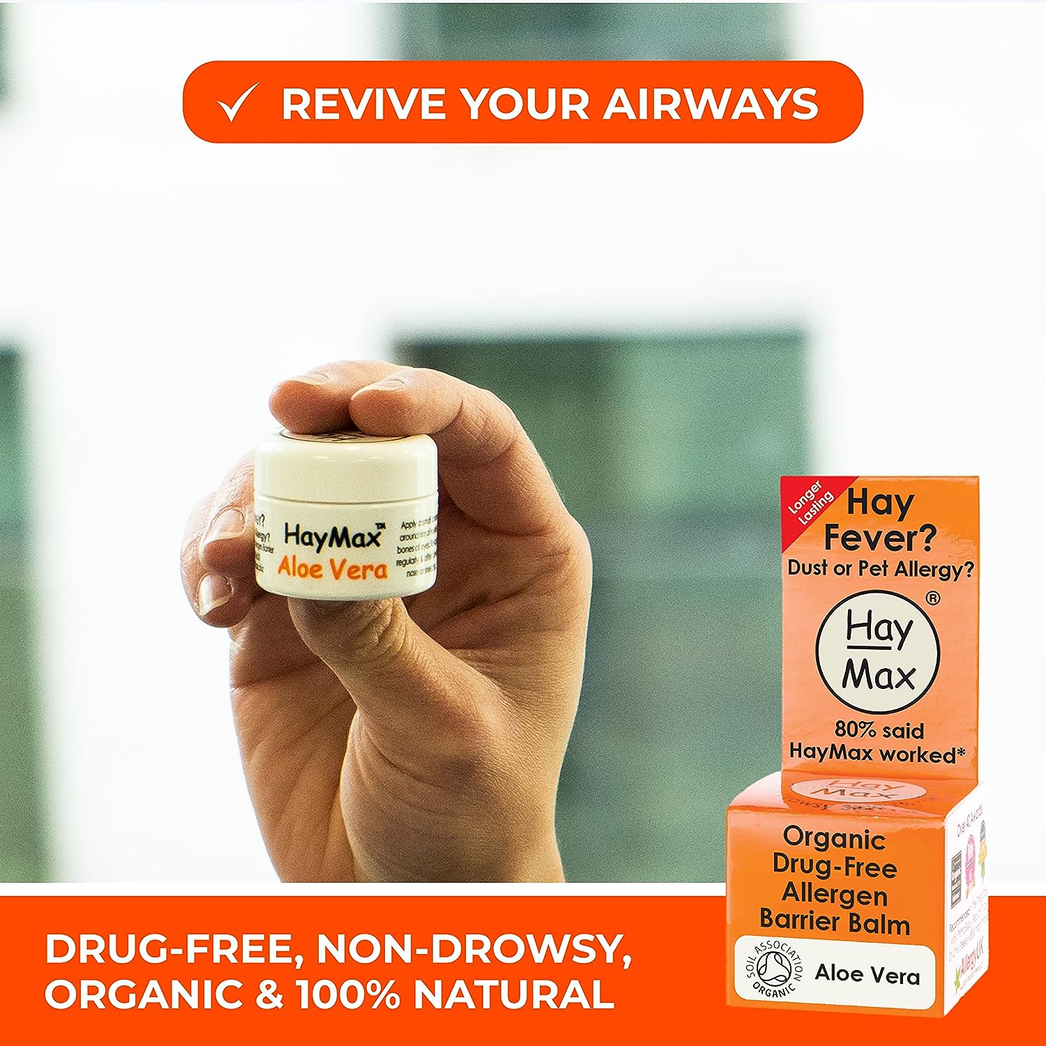 HayMax Organic and drug-free balms are proven to trap over 1/3 of pollen as well as dust and pet allergens before they get in the body. With no drowsy side effects, HayMax Aloe Vera contains Aloe Vera leaf juice powder from the centre of the leaf, known for its soothing and skin healing properties. Less allergens, less sneezing. excellent reviews on TV radio and in press, featured by most of the Media doctors each year, HayMax is growing in popularity every year.