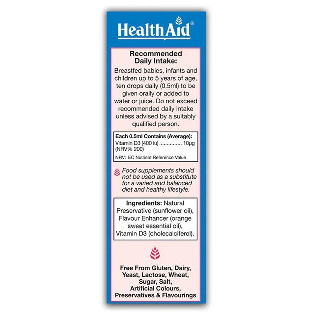 Babyvit-D drops is specially developed for newborn babies, infants and young children to help meet their daily Vitamin D needs. Vitamin D3 plays an essential role in enhancing the immune system and is vital to maintain normal muscle function. It helps regulate the absorption and utilisation of Calcium and Phosphorus and plays a crucial role in bone formation and mineralisation to help the development of strong healthy bones and teeth. HealthAid Babyvit-D drops provides a highly absorbable liquid form of Vitamin D3 with a great tasting orange flavour.
