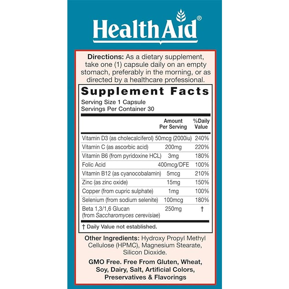 Your immune system is your first line of defence against any viral or bacterial health challenge. So to build up and strengthen your immunity against external threats is a sensible health priority. HealthAid Beta Glucan Complex combines the added benefits of Vitamins C, D3 and B12 as well as Selenium, Copper, Zinc and Folate, which are all known to contribute to the normal function of a healthy immune system. Beta Glucans, a natural and safe ingredient that is known to enhance and improve the immune system. Vitamins C, helps to maintain a strong immune system, important antioxidants that help protect your body cells from oxidative stress, D3 has important roles in addition to its classic effects on calcium and bone homeostasis, Vitamin D can modulate the innate and adaptive immune responses. Deficiency in vitamin D is associated with increased autoimmunity as well as an increased susceptibility to infection. B12 is central to immune processes because it governs cell division and growth. Without adequate B12, white blood cells can't mature and multiply. Folic acid also plays a key role in immune system development and maintenance. Selenium, Copper, Zinc and Folate, which are all known to contribute to the normal function of a healthy immune system.