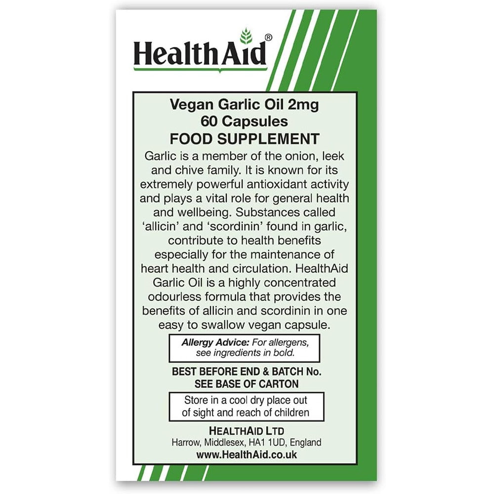 Garlic is a member of the onion, leek and chive family. It is known for its extremely powerful antioxidant activity and plays a vital role for general health and wellbeing. Substances called ?allicin? and ?scordinin? found in garlic, contributes to health benefits especially for the maintenance of heart health, cholesterol and circulation. HealthAid Garlic Oil is a highly concentrated odourless formula that provides the benefits of allicin and scordinin in one easy to swallow vegetarian capsule.