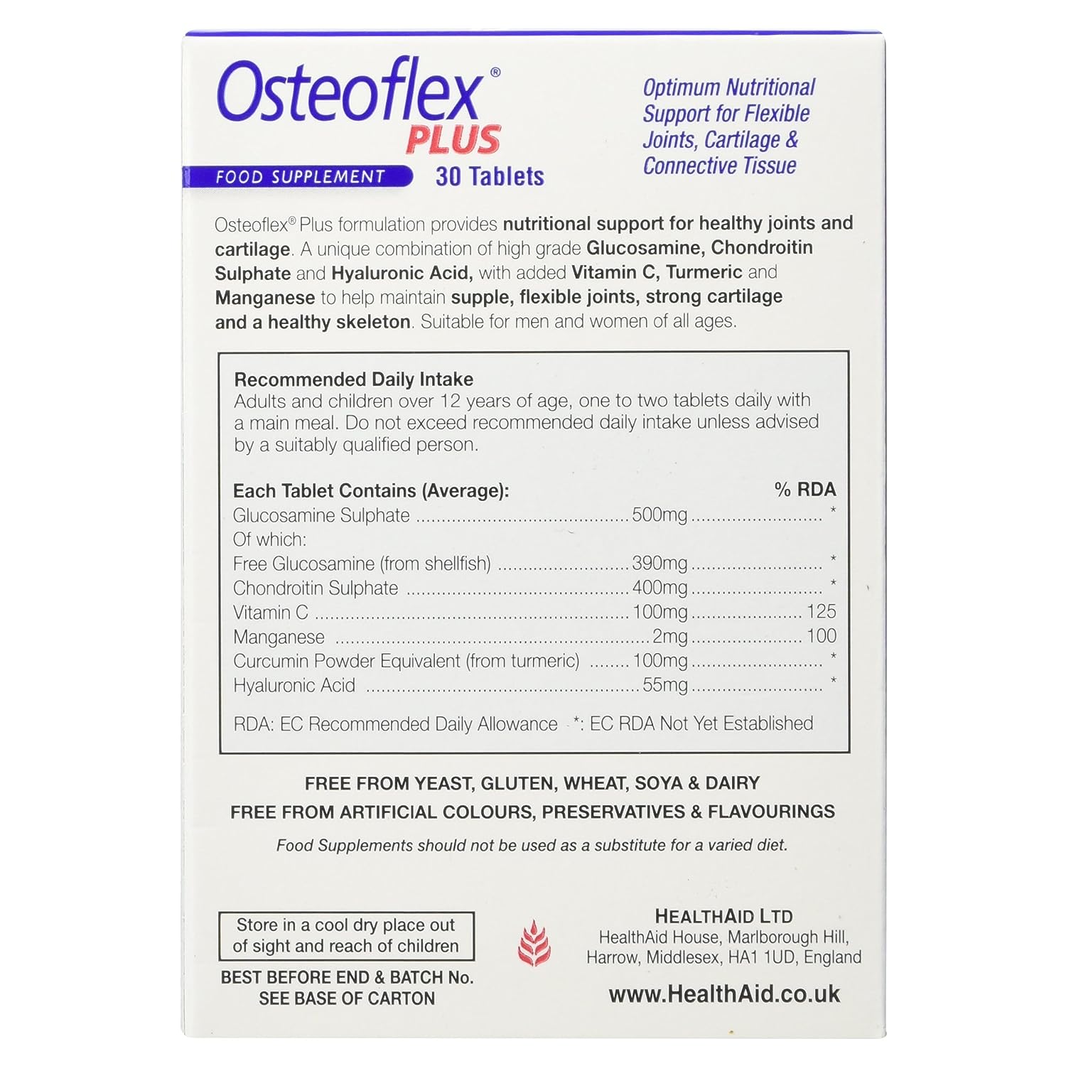 Osteoflex® Plus formulation provides nutritional support for healthy joints and cartilage. A unique combination of high grade Glucosamine, Chondroitin Sulphate and Hyaluronic Acid, with added Vitamin C, Turmeric and Manganese. Suitable for men and women of all ages. Vitamin C contributes to normal collagen formation for the normal function of cartilage and bones. Manganese contributes to the normal formation of connective tissue and the maintenance of normal bones.