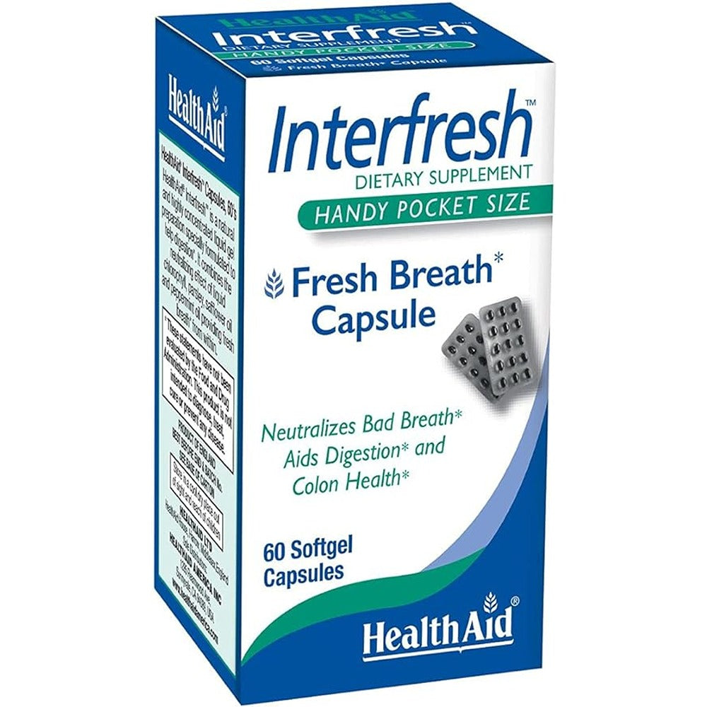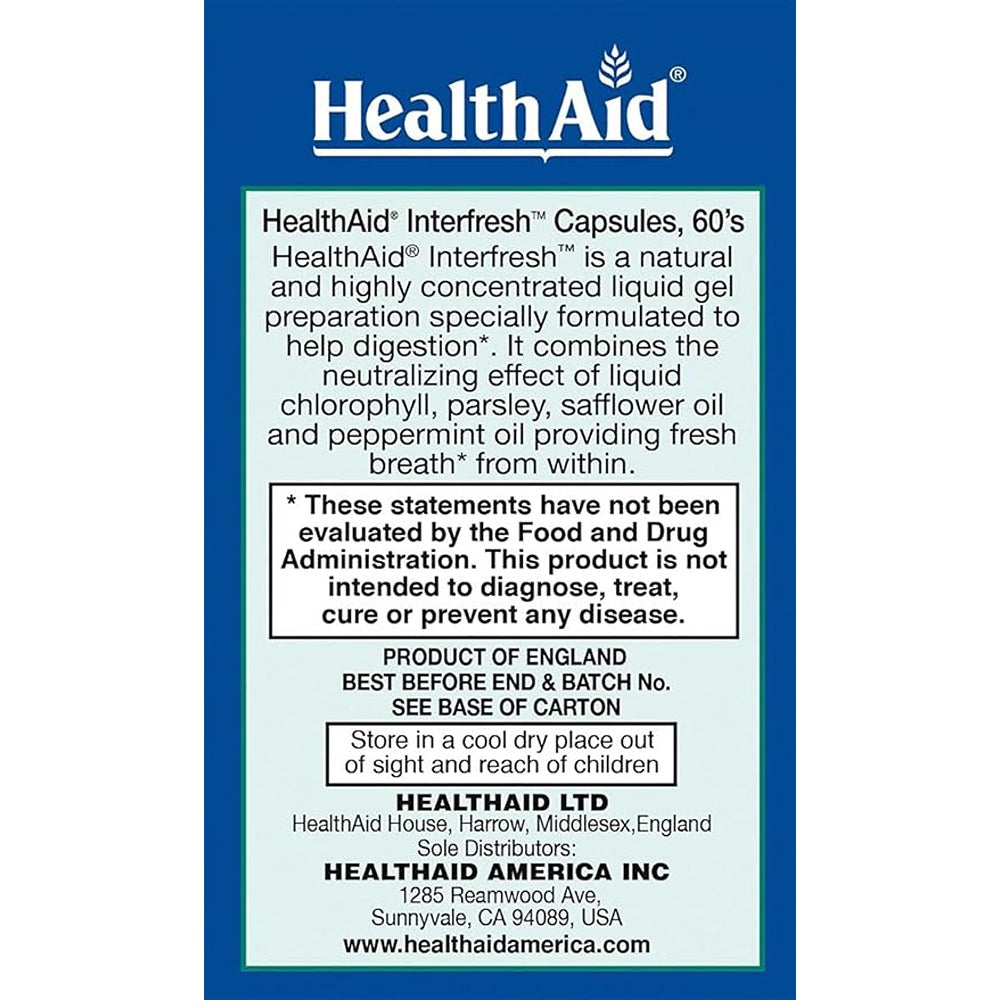 Interfresh? Capsules from HealthAid? are a natural and highly concentrated liquid gel preparation specially formulated to help freshen the breath. Interfresh? Capsules work internally through the digestive system and neutralise bad breath caused by garlic, onion, fish, spicy foods and smoking.? They are also beneficial to overcoming morning breath. Interfresh? Capsules should be taken in the morning to give you day-long confidence or before eating to leave you with fresh minty breath.?There are, however, some health conditions that present with the sign of persistent bad breath. Should this be a concern, please reach out to your health care professional for medical advice.