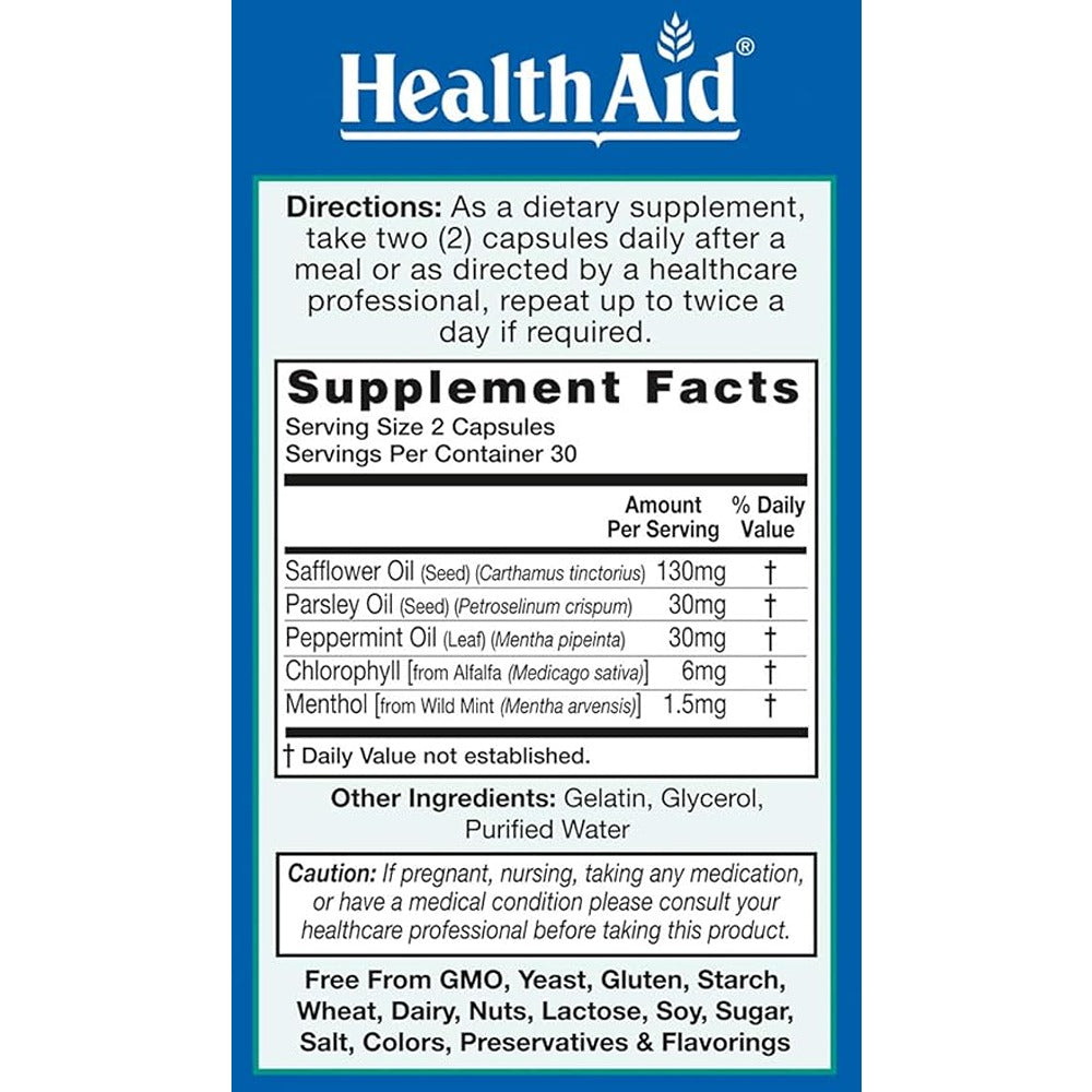 IngredientsSafflower oil, Gelatine, Glycerol, Parsley seed oil, Peppermint oil, Purified Water, Chlorophyll oil, Menthol oil.