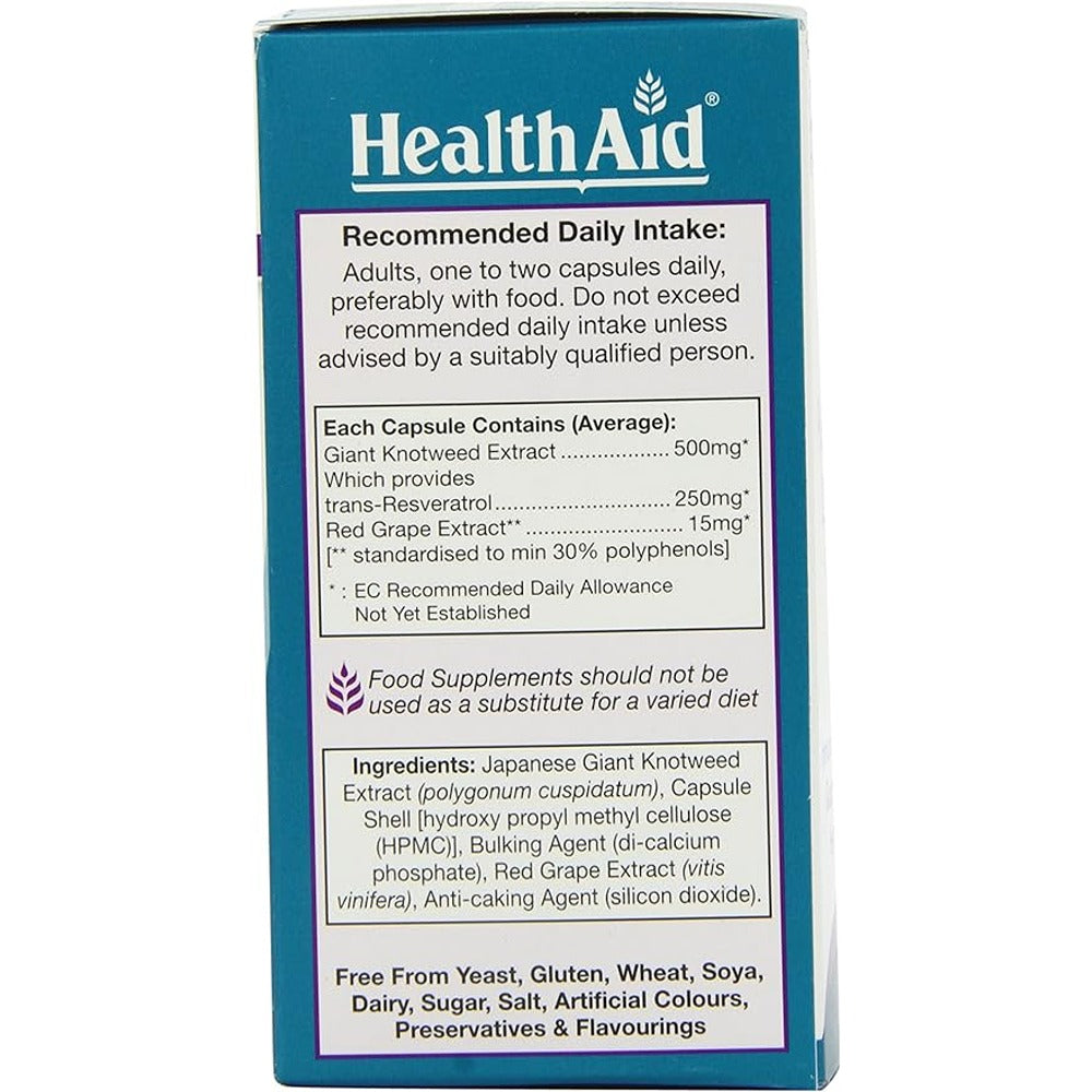 Resveratrol is a naturally occurring nutrient found mostly in dark berries and grapes which is proven to have powerful antioxidant and anti-inflammatory properties. It provides many health benefits, including providing support through the ageing process, balancing blood sugar levels and helping to maintain a healthy heart and immune system. HealthAid combines the benefits of two high quality extracts from Giant Knotweed and Grape, which are rich in polyphenols and provide a trans-form of resveratrol which provides superior biological activity.