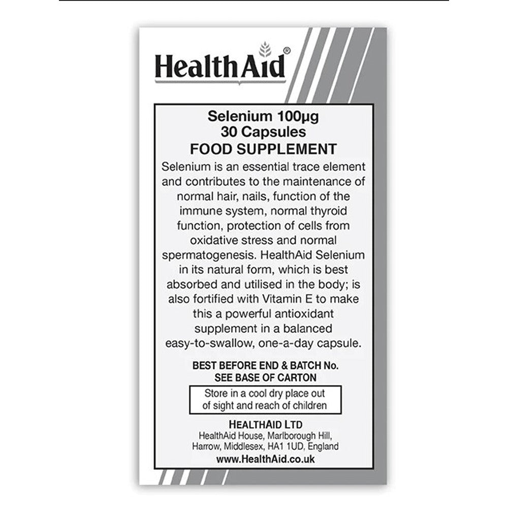 Selenium is an essential trace element which activates one of the most important antioxidant enzymes in the body, protecting tissue cells from oxidative damage caused by free radicals. It is also essential for healthy immune functioning. HealthAid's strong Selenium formulation contains Selenium in its natural form, which is best absorbed and utilised in the body; it is also fortified with Vitamin E to make this a powerful antioxidant supplement in a balanced easy-to swallow, one-a-day capsule.