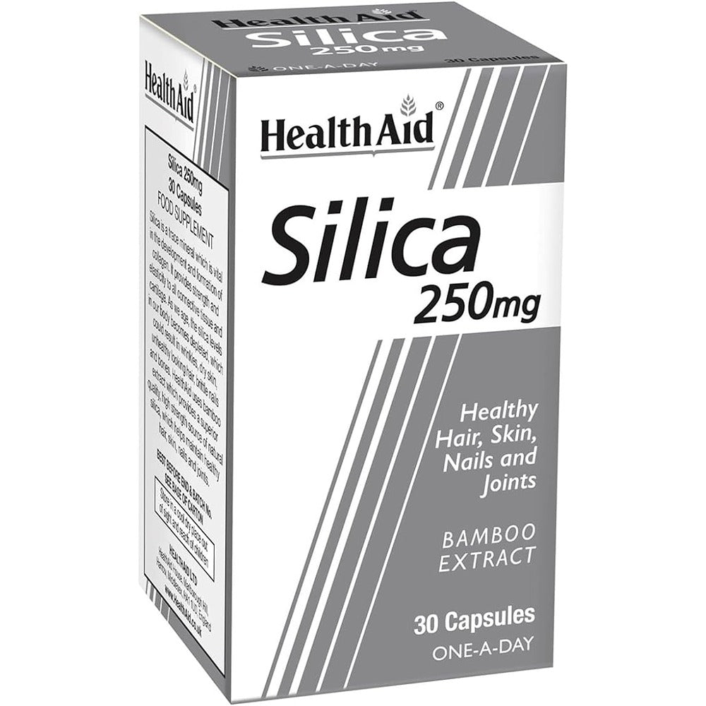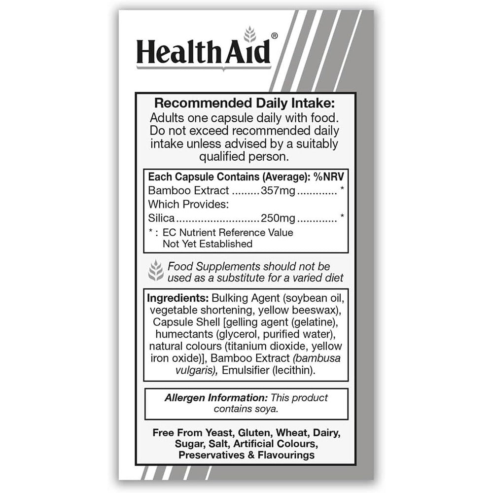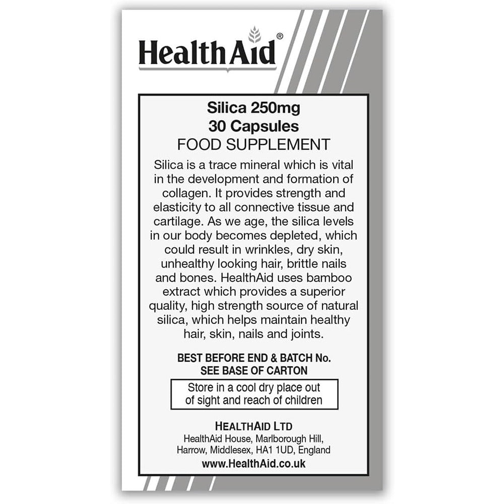 Silica is a trace mineral which is vital in the development and formation of collagen. It provides strength and elasticity to all connective tissue and cartilage. As we age, the silica levels in our body becomes depleted, which could result in wrinkles, dry skin, unhealthy looking hair, brittle nails and bones. Health Aid uses bamboo extract which provides a superior quality, high strength source of natural silica, which helps maintain healthy hair, skin, nails and joints.