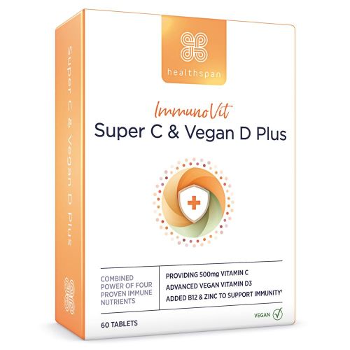 Healthspan have developed a range of immune health supplements containing innovative ingredients combined with proven immune nutrients. Ideal for anyone looking for seasonal protection or year-round immunity support. Immunovit Super C & Vegan D Plus is a combination of four immune health super ingredients: vitamin C, vitamin D, vitamin B12 and zinc. One convenient, daily tablet provides high levels of each to deliver robust support for the immune system and safeguard you from any deficiencies. While most forms of vitamin D are derived from animal sources, this formulation also uses an innovative algal form of vitamin D3, making this product suitable for vegans. *Vitamins B12, C, D and zinc contribute to the normal function of the immune system.