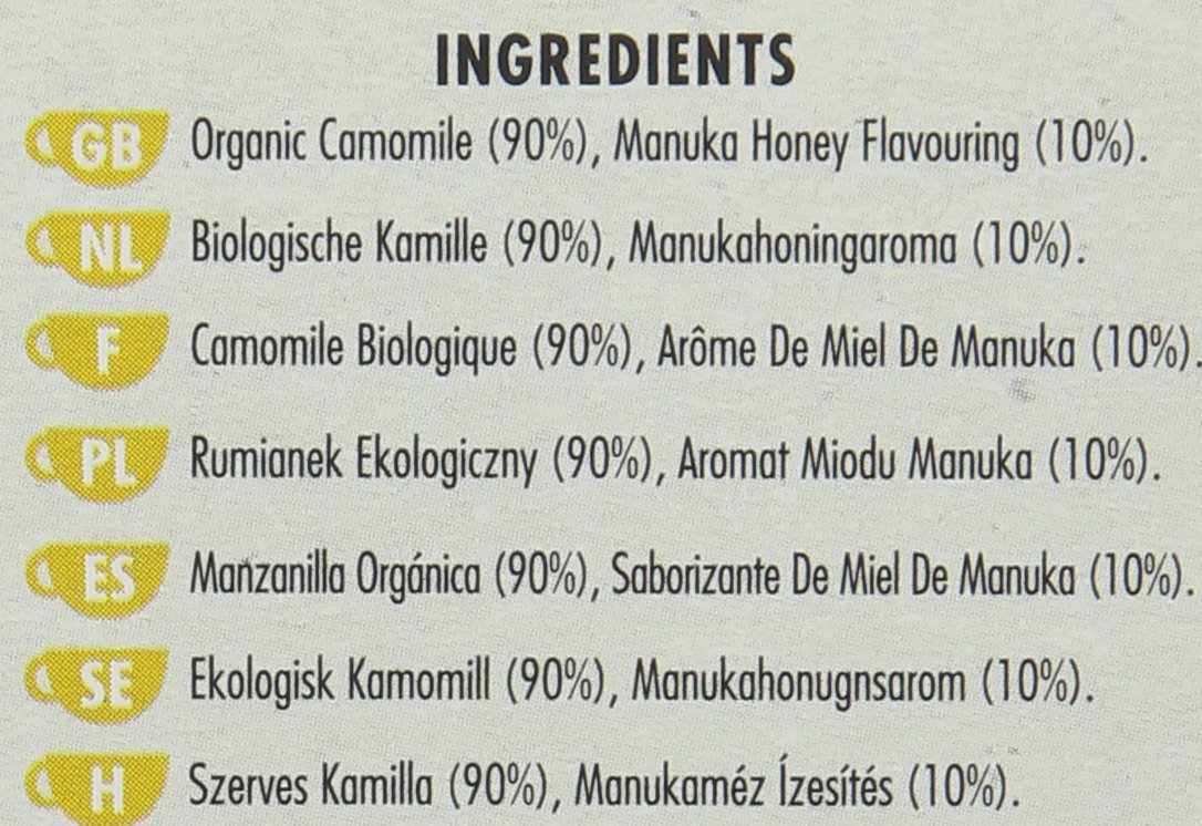 IngredientsOrganice Camomile (90%), Manuka Honey Flavouring (10%).