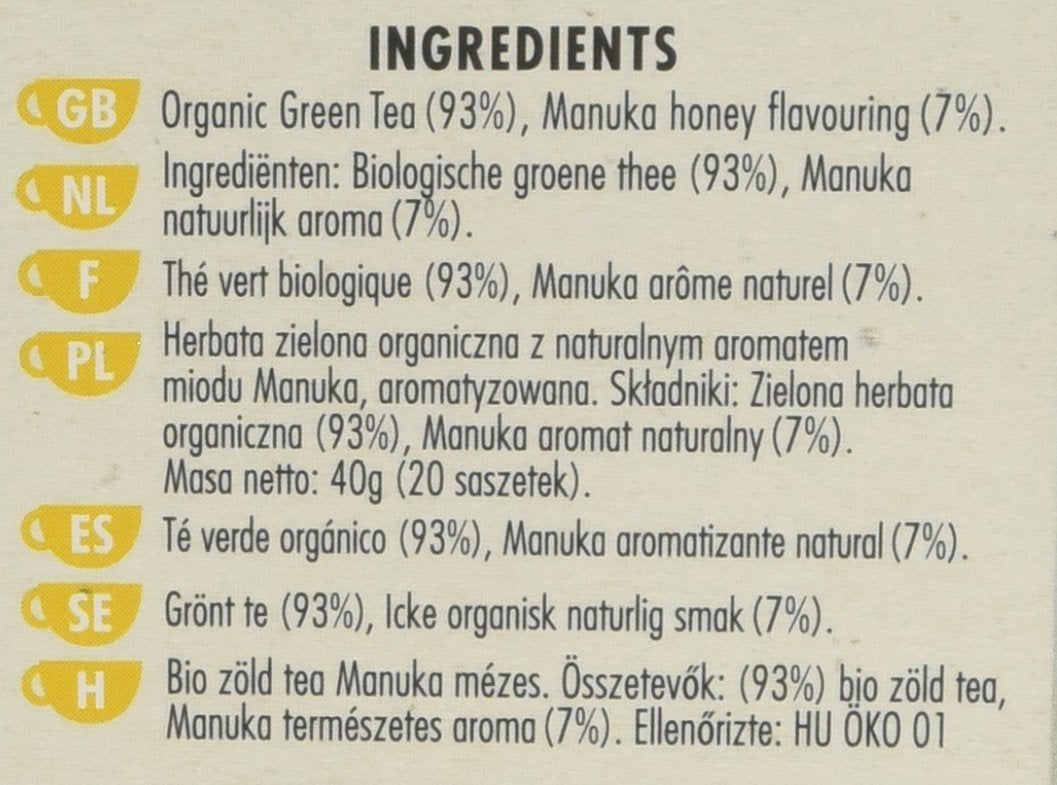 IngredientsOrganic Green Tea (93%), Manuka honey flavouring (7%).