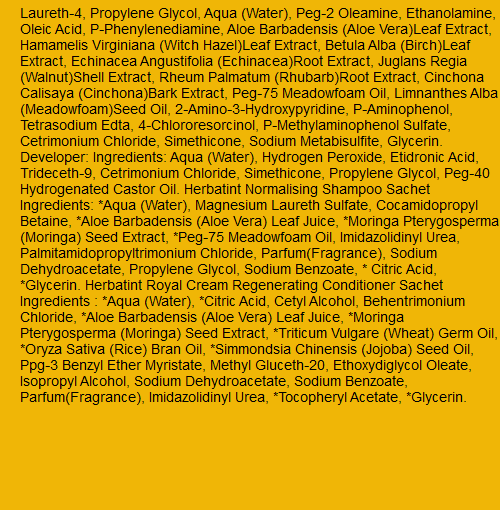 IngredientsLaureth-4, Propylene Glycol, Aqua (Water), Peg-2 Oleamine, Ethanolamine, Oleic Acid, P-Phenylenediamine, Aloe Barbadensis (Aloe Vera)Leaf Extract, Hamamelis Virginiana (Witch Hazel)Leaf Extract, Betula Alba (Birch)Leaf Extract, Echinacea Angustifolia (Echinacea)Root Extract, Juglans Regia (Walnut)Shell Extract, Rheum Palmatum (Rhubarb)Root Extract, Cinchona Calisaya (Cinchona)Bark Extract, Peg-75 Meadowfoam Oil, Limnanthes Alba (Meadowfoam)Seed Oil, 2-Amino-3-Hydroxypyridine, P-Aminophenol, Tetrasodium Edta, 4-Chlororesorcinol, P-Methylaminophenol Sulfate, Cetrimonium Chloride, Simethicone, Sodium Metabisulfite, Glycerin. Developer: Ingredients: Aqua (Water), Hydrogen Peroxide, Etidronic Acid, Trideceth-9, Cetrimonium Chloride, Simethicone, Propylene Glycol, Peg-40 Hydrogenated Castor Oil. Herbatint Normalising Shampoo Sachet Ingredients: *Aqua (Water), Magnesium Laureth Sulfate, Cocamidopropyl Betaine, *Aloe Barbadensis (Aloe Vera) Leaf Juice, *Moringa Pterygosperma (Moringa) Seed Extract, *Peg-75 Meadowfoam Oil, Imidazolidinyl Urea, Palmitamidopropyltrimonium Chloride, Parfum(Fragrance), Sodium Dehydroacetate, Propylene Glycol, Sodium Benzoate, * Citric Acid, *Glycerin. Herbatint Royal Cream Regenerating Conditioner Sachet Ingredients : *Aqua (Water), *Citric Acid, Cetyl Alcohol, Behentrimonium Chloride, *Aloe Barbadensis (Aloe Vera) Leaf Juice, *Moringa Pterygosperma (Moringa) Seed Extract, *Triticum Vulgare (Wheat) Germ Oil, *Oryza Sativa (Rice) Bran Oil, *Simmondsia Chinensis (Jojoba) Seed Oil, Ppg-3 Benzyl Ether Myristate, Methyl Gluceth-20, Ethoxydiglycol Oleate, Isopropyl Alcohol, Sodium Dehydroacetate, Sodium Benzoate, Parfum(Fragrance), Imidazolidinyl Urea, *Tocopheryl Acetate, *Glycerin.