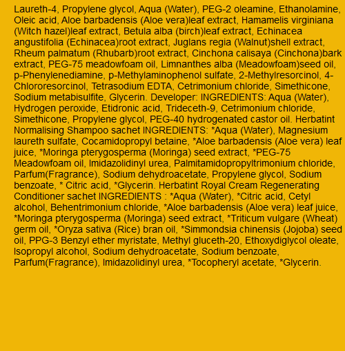 IngredientsLaureth-4, Propylene glycol, Aqua (Water), PEG-2 oleamine, Ethanolamine, Oleic acid, Aloe barbadensis (Aloe vera)leaf extract, Hamamelis virginiana (Witch hazel)leaf extract, Betula alba (birch)leaf extract, Echinacea angustifolia (Echinacea)root extract, Juglans regia (Walnut)shell extract, Rheum palmatum (Rhubarb)root extract, Cinchona calisaya (Cinchona)bark extract, PEG-75 meadowfoam oil, Limnanthes alba (Meadowfoam)seed oil, p-Phenylenediamine, p-Methylaminophenol sulfate, 2-Methylresorcinol, 4- Chlororesorcinol, Tetrasodium EDTA, Cetrimonium chloride, Simethicone, Sodium metabisulfite, Glycerin. Developer: INGREDIENTS: Aqua (Water), Hydrogen peroxide, Etidronic acid, Trideceth-9, Cetrimonium chloride, Simethicone, Propylene glycol, PEG-40 hydrogenated castor oil. Herbatint Normalising Shampoo sachet INGREDIENTS: *Aqua (Water), Magnesium laureth sulfate, Cocamidopropyl betaine, *Aloe barbadensis (Aloe vera) leaf juice, *Moringa pterygosperma (Moringa) seed extract, *PEG-75 Meadowfoam oil, Imidazolidinyl urea, Palmitamidopropyltrimonium chloride, Parfum(Fragrance), Sodium dehydroacetate, Propylene glycol, Sodium benzoate, * Citric acid, *Glycerin. Herbatint Royal Cream Regenerating Conditioner sachet INGREDIENTS : *Aqua (Water), *Citric acid, Cetyl alcohol, Behentrimonium chloride, *Aloe barbadensis (Aloe vera) leaf juice, *Moringa pterygosperma (Moringa) seed extract, *Triticum vulgare (Wheat) germ oil, *Oryza sativa (Rice) bran oil, *Simmondsia chinensis (Jojoba) seed oil, PPG-3 Benzyl ether myristate, Methyl gluceth-20, Ethoxydiglycol oleate, Isopropyl alcohol, Sodium dehydroacetate, Sodium benzoate, Parfum(Fragrance), Imidazolidinyl urea, *Tocopheryl acetate, *Glycerin.