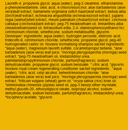 IngredientsLaureth-4, propylene glycol, aqua (water), peg-2 oleamine, ethanolamine, p-phenylenediamine, oleic acid, 4-chlororesorcinol, aloe barbadensis (aloe vera)leaf extract, hamamelis virginiana (witch hazel)leaf extract, betula alba (birch)leaf extract, echinacea angustifolia (echinacea)root extract, juglans regia (walnut)shell extract, rheum palmatum (rhubarb)root extract, cinchona calisaya (cinchona)bark extract, peg-75 meadowfoam oil, limnanthes alba (meadowfoam)seed oil, tetrasodium edta, 2,4- diaminophenoxyethanol hcl, cetrimonium chloride, simethicone, sodium metabisulfite, glycerin. Developer: ingredients: aqua (water), hydrogen peroxide, etidronic acid, trideceth-9, cetrimonium chloride, simethicone, propylene glycol, peg-40 hydrogenated castor oil. Novavis normalising shampoo sachet ingredients: *aqua (water), magnesium laureth sulfate, cocamidopropyl betaine, *aloe barbadensis (aloe vera) leaf juice, *moringa pterygosperma (moringa) seed extract, *peg-75 meadowfoam oil, imidazolidinyl urea, palmitamidopropyltrimonium chloride, parfum(fragrance), sodium dehydroacetate, propylene glycol, sodium benzoate, * citric acid, *glycerin. Novavis royal cream regenerating conditioner sachet ingredients : *aqua (water), *citric acid, cetyl alcohol, behentrimonium chloride, *aloe barbadensis (aloe vera) leaf juice, *moringa pterygosperma (moringa) seed extract, *triticum vulgare (wheat) germ oil, *oryza sativa (rice) bran oil, *simmondsia chinensis (jojoba) seed oil, ppg-3 benzyl ether myristate, methyl gluceth-20, ethoxydiglycol oleate, isopropyl alcohol, sodium dehydroacetate, sodium benzoate, parfum(fragrance), imidazolidinyl urea, *tocopheryl acetate, *glycerin.