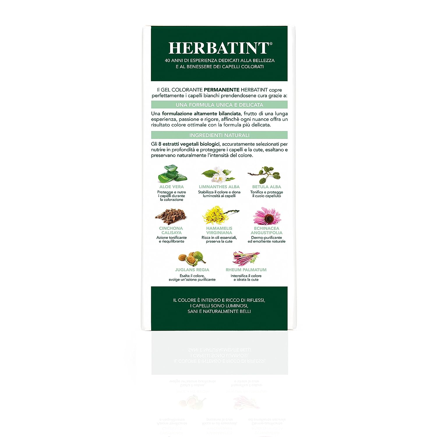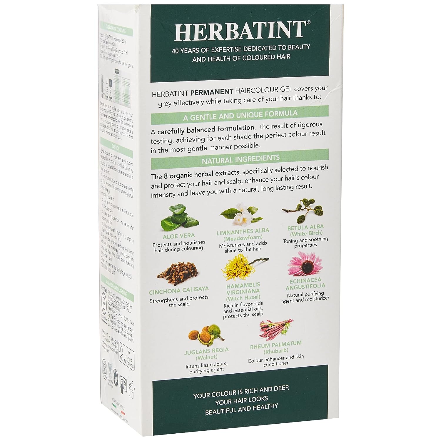 IngredientsLaureth-4, Propylene glycol, Aqua (Water), PEG-2 oleamine, Ethanolamine, Oleic acid, Aloe barbadensis (Aloe vera)leaf extract, Hamamelis virginiana (Witch hazel)leaf extract, Betula alba (birch)leaf extract, Echinacea angustifolia (Echinacea)root extract, Juglans regia (Walnut)shell extract, Rheum palmatum (Rhubarb)root extract, Cinchona calisaya (Cinchona)bark extract, PEG-75 meadowfoam oil, Limnanthes alba (Meadowfoam)seed oil, p-Phenylenediamine, 4-Chlororesorcinol, Tetrasodium EDTA, Cetrimonium chloride, Simethicone, Sodium metabisulfite, Glycerin. Developer: INGREDIENTS: Aqua (Water), Hydrogen peroxide, Etidronic acid, Trideceth-9, Cetrimonium chloride, Simethicone, Propylene glycol, PEG-40 hydrogenated castor oil. Herbatint Normalising Shampoo sachet INGREDIENTS: *Aqua (Water), Magnesium laureth sulfate, Cocamidopropyl betaine, *Aloe barbadensis (Aloe vera) leaf juice, *Moringa pterygosperma (Moringa) seed extract, *PEG-75 Meadowfoam oil, Imidazolidinyl urea, Palmitamidopropyltrimonium chloride, Parfum(Fragrance), Sodium dehydroacetate, Propylene glycol, Sodium benzoate, * Citric acid, *Glycerin. Herbatint Royal Cream Regenerating Conditioner sachet INGREDIENTS : *Aqua (Water), *Citric acid, Cetyl alcohol, Behentrimonium chloride, *Aloe barbadensis (Aloe vera) leaf juice, *Moringa pterygosperma (Moringa) seed extract, *Triticum vulgare (Wheat) germ oil, *Oryza sativa (Rice) bran oil, *Simmondsia chinensis (Jojoba) seed oil, PPG-3 Benzyl ether myristate, Methyl gluceth-20, Ethoxydiglycol oleate, Isopropyl alcohol, Sodium dehydroacetate, Sodium benzoate, Parfum(Fragrance), Imidazolidinyl urea, *Tocopheryl acetate, *Glycerin.