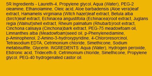 Ingredients5R Ingredients - Laureth-4, Propylene glycol, Aqua (Water), PEG-2 oleamine, Ethanolamine, Oleic acid, Aloe barbadensis (Aloe vera)leaf extract, Hamamelis virginiana (Witch hazel)leaf extract, Betula alba (birch)leaf extract, Echinacea angustifolia (Echinacea)root extract, Juglans regia (Walnut)shell extract, Rheum palmatum (Rhubarb)root extract, Cinchona calisaya (Cinchona)bark extract, PEG-75 meadowfoam oil, Limnanthes alba (Meadowfoam)seed oil, p-Phenylenediamine, p-Aminophenol, 2-Amino-3-hydroxypyridine, 4-Chlororesorcinol, Tetrasodium EDTA, Cetrimonium chloride, Simethicone, Sodium metabisulfite, Glycerin. INGREDIENTS: Aqua (Water), Hydrogen peroxide, Etidronic acid, Trideceth-9, Cetrimonium chloride, Simethicone, Propylene glycol, PEG-40 hydrogenated castor oil.