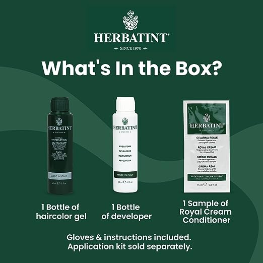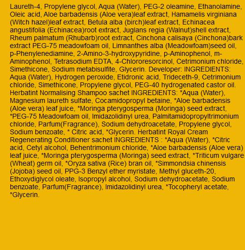 IngredientsLaureth-4, Propylene glycol, Aqua (Water), PEG-2 oleamine, Ethanolamine, Oleic acid, Aloe barbadensis (Aloe vera)leaf extract, Hamamelis virginiana (Witch hazel)leaf extract, Betula alba (birch)leaf extract, Echinacea angustifolia (Echinacea)root extract, Juglans regia (Walnut)shell extract, Rheum palmatum (Rhubarb)root extract, Cinchona calisaya (Cinchona)bark extract PEG-75 meadowfoam oil, Limnanthes alba (Meadowfoam)seed oil, p-Phenylenediamine, 2-Amino-3-hydroxypyridine, p-Aminophenol, m- Aminophenol, Tetrasodium EDTA, 4-Chlororesorcinol, Cetrimonium chloride, Simethicone, Sodium metabisulfite, Glycerin. Developer: INGREDIENTS: Aqua (Water), Hydrogen peroxide, Etidronic acid, Trideceth-9, Cetrimonium chloride, Simethicone, Propylene glycol, PEG-40 hydrogenated castor oil. Herbatint Normalising Shampoo sachet INGREDIENTS: *Aqua (Water), Magnesium laureth sulfate, Cocamidopropyl betaine, *Aloe barbadensis (Aloe vera) leaf juice, *Moringa pterygosperma (Moringa) seed extract, *PEG-75 Meadowfoam oil, Imidazolidinyl urea, Palmitamidopropyltrimonium chloride, Parfum(Fragrance), Sodium dehydroacetate, Propylene glycol, Sodium benzoate, * Citric acid, *Glycerin. Herbatint Royal Cream Regenerating Conditioner sachet INGREDIENTS : *Aqua (Water), *Citric acid, Cetyl alcohol, Behentrimonium chloride, *Aloe barbadensis (Aloe vera) leaf juice, *Moringa pterygosperma (Moringa) seed extract, *Triticum vulgare (Wheat) germ oil, *Oryza sativa (Rice) bran oil, *Simmondsia chinensis (Jojoba) seed oil, PPG-3 Benzyl ether myristate, Methyl gluceth-20, Ethoxydiglycol oleate, Isopropyl alcohol, Sodium dehydroacetate, Sodium benzoate, Parfum(Fragrance), Imidazolidinyl urea, *Tocopheryl acetate, *Glycerin.