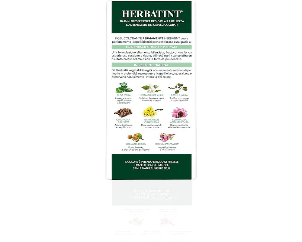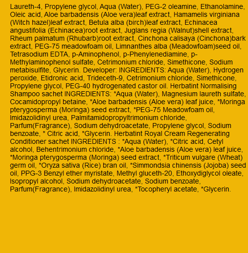 IngredientsLaureth-4, Propylene glycol, Aqua (Water), PEG-2 oleamine, Ethanolamine, Oleic acid, Aloe barbadensis (Aloe vera)leaf extract, Hamamelis virginiana (Witch hazel)leaf extract, Betula alba (birch)leaf extract, Echinacea angustifolia (Echinacea)root extract, Juglans regia (Walnut)shell extract, Rheum palmatum (Rhubarb)root extract, Cinchona calisaya (Cinchona)bark extract, PEG-75 meadowfoam oil, Limnanthes alba (Meadowfoam)seed oil, Tetrasodium EDTA, p-Aminophenol, p-Phenylenediamine, p- Methylaminophenol sulfate, Cetrimonium chloride, Simethicone, Sodium metabisulfite, Glycerin. Developer: INGREDIENTS: Aqua (Water), Hydrogen peroxide, Etidronic acid, Trideceth-9, Cetrimonium chloride, Simethicone, Propylene glycol, PEG-40 hydrogenated castor oil. Herbatint Normalising Shampoo sachet INGREDIENTS: *Aqua (Water), Magnesium laureth sulfate, Cocamidopropyl betaine, *Aloe barbadensis (Aloe vera) leaf juice, *Moringa pterygosperma (Moringa) seed extract, *PEG-75 Meadowfoam oil, Imidazolidinyl urea, Palmitamidopropyltrimonium chloride, Parfum(Fragrance), Sodium dehydroacetate, Propylene glycol, Sodium benzoate, * Citric acid, *Glycerin. Herbatint Royal Cream Regenerating Conditioner sachet INGREDIENTS : *Aqua (Water), *Citric acid, Cetyl alcohol, Behentrimonium chloride, *Aloe barbadensis (Aloe vera) leaf juice, *Moringa pterygosperma (Moringa) seed extract, *Triticum vulgare (Wheat) germ oil, *Oryza sativa (Rice) bran oil, *Simmondsia chinensis (Jojoba) seed oil, PPG-3 Benzyl ether myristate, Methyl gluceth-20, Ethoxydiglycol oleate, Isopropyl alcohol, Sodium dehydroacetate, Sodium benzoate, Parfum(Fragrance), Imidazolidinyl urea, *Tocopheryl acetate, *Glycerin.