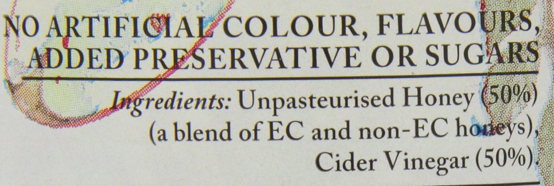 IngredientsUnpasteurised honey 50% (product of Spain or Argentina), cider vinegar 50%.
