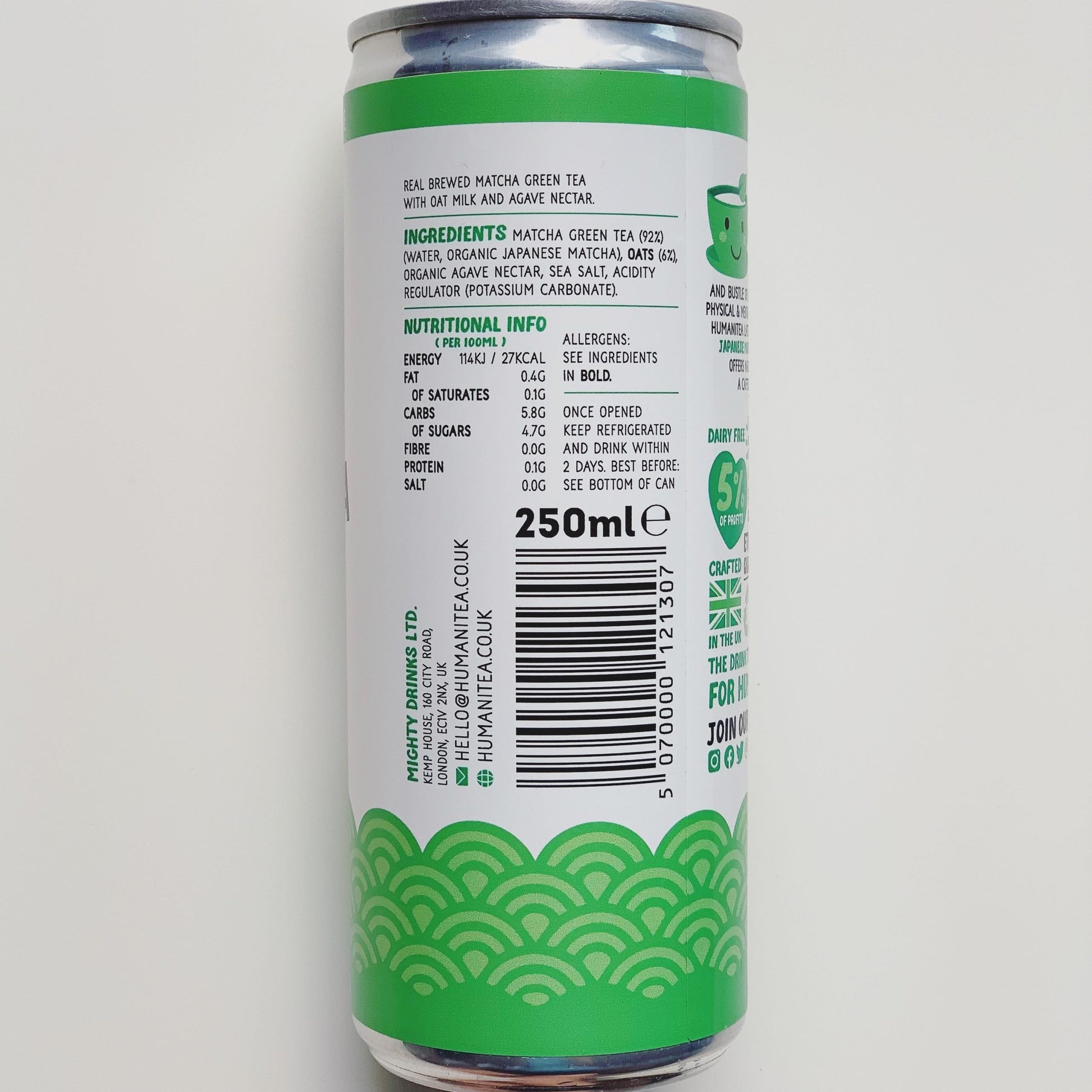 Matcha Green Tea (92%) (Water, Organic Japanese Matcha), Oats (6%), Organic Agave Nectar, Sea Salt, Acidity Regulator (Potassium Carbonate)